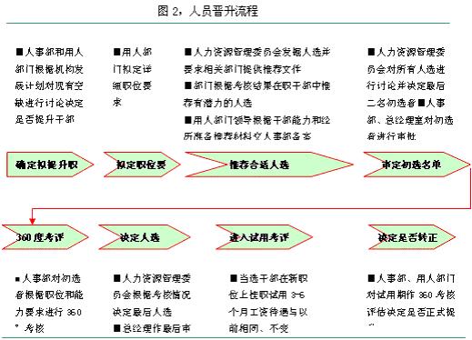 人员配置应晋升最优秀的人才,给予他们发展机会,同时淘汰表现差的干部。因此人员配置一般有人员的晋升、淘汰与轮换三种重要影响的机制,三者并行,可帮助提高公司的整体干部素质。但如果其中一个环节做的不好,将会影响全局。另外,接班人计划也是人员配置的重要内容。 现在国内很多的人力资源读物往往更多地在谈论绩效管理、薪酬设计、人员招聘培训之类,却有意无意的忽略了人员配置这一人力资源管理的重要模块。绩效考评结果的运用也往往仅仅是为了解决一个奖金分配问题,很少将绩效考评结果与人员配置结合起来。在笔者咨询的大多数公司往往没有人员配置制度。人员的晋升、淘汰、轮换往往无据可依。 一、人员晋升体系设计 人员晋升必须有一个非常清楚的标准,竞争的机制和一个严格的试用期考核过程以确保质量。晋升应有严谨的流程,包含许多步骤。如图2。