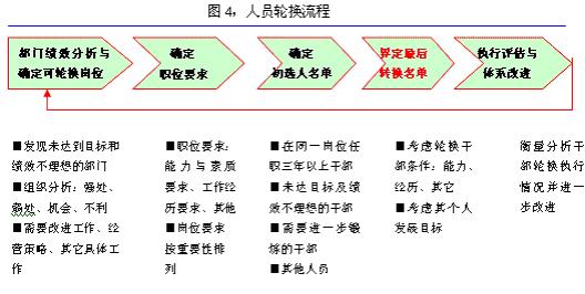 STEP2,收集每个个案的资料,并进行分析 对于部门经理层则由人力资源部门准备个人材料,公司总经理室成员与人力资源经理对排名最低的10%有人员情况进行讨论与分析。同时将决定淘汰人的名单交公司董事会备案;对于一般干部,由所在部门经理准备个人材料,公司人力资源部和部门经理对排名最低的5%的干部情况进行分析,同时将决定淘汰人的名单交总经理室备案。 由于淘汰对干部的影响甚大,人力资源部与各部门经理不但应于会前详细搜集干部的各方面资料,更要在会议中妥善讨论、决定,并在会后谨慎处理,才能让淘汰机制发挥正面性作用。 STEP3,决定处理策略 干部表现不佳的原因有很多,透过事前资料搜集以及会议中充分的讨论后,公司应相应采取适当的处理方法。 1、解雇:解雇无改进可能的干部,但也给予情有可原或仍有潜力的干部改进的机会。 2、降级使用:对于能力不够有干部予以降级,但必须按比例严格执行。 3、留职察看(转入观察期):对于有潜力或原因不明的干部要转入观察期,建立在短期内(3-6个月)必须达到具体或量化的目标,当干部有明显改进时,鼓励并告知他们,当无明显改进时,立即解雇。 4、轮换:对于能力不适合现职的给予职位轮换。 STEP4,干部淘汰体系评估与改进 人力资源部每年应统计、分析淘汰执行情况,做适当修正,并交总经理室成员传阅,以确保淘汰制度之落实并建立系统的公信力。人力资源部应严格检查各部门执行情况,对不尽责任的领导进行处理。 三、人员轮换体系设计流程 有效的干部轮换应考虑组织工作要求和个人发展需要。人员轮换流程,如图4。