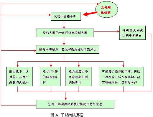 STEP1,拟定职位的详细职位要求 一般地,预先建立详细的任职要求工作经历、专业知识和管理能力要求,使选择和考核有方向和重点,职位要求包括工作职责、所需能力、工作经验(对于建立公司素质模型的则采用素质模型测评中心的办法)。样式可参见《工作分析与岗位设计手册》之《工作说明书---入职要求》。但不可照搬。 STEP2,发掘更多人选 人力资源管理部门对职位要求审核同时发掘更多人选,以加强竞争,使选择更公平。 STEP3,考评或测评 人力资源部门应根据选择要求,针对性地进行测评(未建立干部素质模型的公司可采用360度考评;建立干部素质模型的公司采用基于素质模型的人力资源测评),人力资源管理委员会要讨论并决定最后晋升人选、结果及所有相关资料送交总经理室审批。 STEP4,试用与试用后考评(测评) 通过考评之后进入试用。在试用期前对晋升干部建立绩效评估指标并清楚告诉他们,经过三到六个月的试用期后,人力资源部要在正式晋升前再做一次360度的绩效评估,以确定被晋升其人能否胜任新职。 STEP5,人员晋升体系评估与改进 二、人员淘汰体系设计 淘汰应从系统性地发现不合格干部开始,用科学的方法进行分析,最后用公平的方式对他们进行处理。淘汰流程如图3。 STEP1,找出不合格的干部 每年会根据干部总体表现、市场状况以及公司期望设定淘汰比例,而不同类别的干部可以有不同的淘汰比例以提高干部的素质和完成其职业发展规划。 对于部门经理,公司总经理室成员在年中、年终对所有部门经理的业绩,能力进行硬性排名,发现排名最低的10%干部。对突发性案另行处理。 对于一般干部,对绩效评估差的部门淘汰目标也应相应提高,部门经理对部门干部工作态度,技能和完成工作情况进行硬性排名,发现排名最低的5%干部;对少于10人的部门应将排名最后一名的干部放入考虑淘汰名单。对突发性案另行处理。