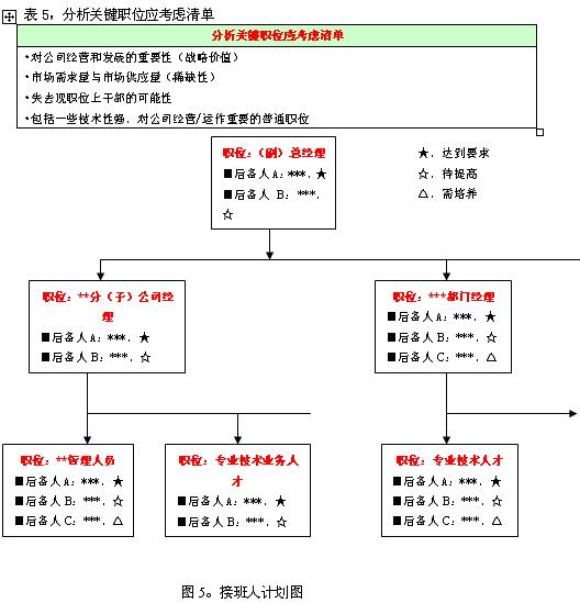 分析关键职位应考虑清单 对公司经营和发展的重要性(战略价值) 市场需求量与市场供应量(稀缺性) 失去现职位上干部的可能性 包括一些技术性强,对公司经营/运作重 的普通职位 STEP2,明确职位要求 人力资源部应安排各部门,建立详细的关键职位要求。 STEP3,接班人的来源 各部门与人力资源部一起应根据职位要求和考核结果,进行分析,并最终确定岗位接班人。同时对他们提出发展方向。 接班人的来源一般有四个: 一是重点人才培养计划体系所提供的人才。 二是绩效考评结果。 三是外部招聘。 四是中高层经理人员的推荐。 STEP4,对初选的接班人的评估 如何做好关键岗位的接班人计划已经成为企业发展的人力资源战略之一。企业为建立和维护后备人才计划体系,应当定期或不定期地进行选拔性评估。接班人的评估需要一个专门的委员会(或专门的评估中心)在一个相对一致的评价标准和参照背景下对候选人的潜能/价值观进行评估(素质评估);最后也需要了解与候选人有直接工作关系的人对其工作行为的360度反馈。 STEP5,接班人计划体系评估 人力资源部负责每年对岗位后备执行情况进行分析,确保制度完善。接班人计划分析如图5。 决定接班人计划成功与否的标准包括: ■在任何工重要职位出缺时,公司内部有一位或两位合适的人选可立刻接替。 ■被晋升(或其他工作的安排)的干部,表现多半成功,而只有少数人失败。 ■只有少数几位优秀干部因“缺少晋升机会”而离职。 |