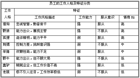 可能会有这样的员工,第一个选择的动物是野牛,第二个选择的动物是老鼠,第三个选择的动物却是笨猪。这名员工在平时可能会显得像野牛一样倔强,与人顶撞。然而他的本意,却希望自己像一只老鼠那样不引人注目。而他真实的自己,甚至连他自己也不知道的内在,却是一个带有很强依赖性、对自己的能力和不足看得明明白白,对公司和主管极为忠诚的员工。 也可能会有这样的员工,他第一个动物选择的是猎狗,第二个动物选择的是狐狸,第三个动物却是刺猬。这表明,他在表面上做出一副忠诚肯干勤勤恳恳任劳任怨的模样,而在内心里却将自己视为聪明的狐狸,总是试图用最小的成本获取最高的利益。然而实际上,他真正的内在工作人格却是一只刺猬,好斗,滋事生非,处处与人为难。 在企业中,员工的真实自我是受到深深的压抑的,最常表现出来的是员工的主观人格与印象人格。印象人格是员工依据公司对自己的期望所努力的目标,或者说,印象人格是员工力图表现出来给公司看的。主观人格则是员工自我的认定与定位,受到真实人格的影响,显得极不稳定。因此,每个人都认为自己是矛盾的,性格是多重的,这个所谓多重,就是主观人格、印象人格与真实人格重叠所造成的错觉。 事实上,整个世界都是生活在错觉之中,我们都是通过自己的努力试图向人们表明什么,所以美国社会学家简•卡尔岑说:所有的行业都是表演行业。对于企业的员工来讲,就更是如此。 员工会根据环境的变化,依据利益的考量,把自己塑造成某一种形象,例如,一个主观印象是笨猪的员工,如果发现自己的忠诚无法保证自己的利益,那么,苦闷的笨猪就有可能表现出刺猬的特性。反之,一只刺猬吃过太多的苦头之后,就会让自己表现得看起来象一只狐狸。 案例:蠢驴“惊变” 我们先来看一个案例。 阿灵手下有四个员工:野牛、刺猬、蠢驴、笨猪(我们姑且用代表他们工作人格的动物来称呼)。 一名野牛,最擅长公关,几乎所有的大客户都是由他来负责摆平,但是野牛不服从管理,每次都是阿灵苦苦哀求,他这才不情不愿的出马工作,野牛的派头经常把阿灵气得眼泪汪汪。 一名刺猬,主要用他来应付那些蛮不讲理的客户,遇到客户胡搅蛮缠的时候,阿灵就让刺猬出马,把对方骂个狗血喷头,等对方气急败坏之时,阿灵再出来装好人收拾局面,给客户赔礼道歉,客户已经被刺猬修理得筋疲力尽,对公司的期望值自然而然也就降低了,听到几句好话,也就不再追究了。 一名笨猪,笨猪虽然工作能力极差,可是当刺猬或者是野牛跟阿灵顶撞的时候,这就用着他了,忠诚的笨猪义无反顾的站在阿灵一方,与刺猬野牛争吵,所以笨猪虽然没有业绩,却是部门中地位仅次于阿灵主管的员工。 部门里还有一名蠢驴,主要用来应付那些纠缠不休的小客户。做过客户服务的都知道,越是小客户就越难缠,80%的小客户只为公司提供了不足20%的利润,却耗费了公司80%的成本。所以几乎任何一家公司对小客户的要求向来都是应付了事,喊上几句动听的口号,哄哄小客户高兴,如果真要是把每个小客户都当做是上帝的话,那么任何一家公 都会因应付不起“上帝”的苛求而关门。 这名蠢驴就是客户服务部用来糊弄小客户的。糊弄小客户的办法也很简单,就是设立繁琐的服务规章提高客户要求服务的成本,如果客户提出要求,就告诉客户说已经转由技术部处理,过几天客户再追问,就告诉他已经由技术部转研发部了,再请稍等,再过几天客户再问,又说已经由研发部转调研部了,请继续等待,又过几天客户再问,接着说调研部正在调研中,请等待结果。过几天客户要是还不识趣的话,继续纠缠追问,就告诉他已经从调研部转业务部了,业务部正在研究……如此这般这般如此,把客户拖得筋疲力尽,拖得无精打采有气无力,再也没心思跟你胡闹,客户服务就算是圆满完成了。 按说蠢驴的工作应该很轻松才对,可是错了,蠢驴弄不清客户的大小,真诚的面对每一个客户,连客户都不相信的什么客户就是上帝的胡言乱语,蠢驴却相信。于是蠢驴每天辛辛苦苦的奔波于小客户之间,疲于奔命的为客户解决问题,加班加点是经常的事情,甚至连午饭晚饭都顾不上吃,累得自己眼窝深陷,气息奄奄,那副形象严重影响了公司的声誉。 阿灵一看,蠢驴这样下去不成啊,就再招聘了一名员工,帮助蠢驴服务小客户。 对于新人的来到,蠢驴表示了热情的欢迎。很快,在蠢驴的指导下,新人开始上手工作,慢慢的接过来蠢驴手中的活,蠢驴开始轻松起来,再遇到客户要求,就吩咐新员工:“我已经替你联系好了,你快去。”新员工刚来不久,急于表现,就立即出发去服务小客户。这样的日子慢慢的形成了定势,没多久,蠢驴就什么活也不干了,埋头苦干的员工才配得蠢驴的资格,既然他现在不再干活了,当然就不能再叫蠢驴了。 蠢驴在悄悄的进化。 进化之后的蠢驴不再愚蠢,变得狡滑起来,阿灵吩咐的小客户的工作他只是象征性的应付应付,却把主要的精力放在了往老板那里跑,把部门里的情况向老总汇报,有几次阿灵没有处理好工作,蠢驴立即急不可耐的向老总打了小报告,结果让老总打电话把阿灵训斥了一顿。 直到这时候阿灵才如梦方醒,这头缺乏工作价值评判能力的蠢驴,竟然进化成为了一条狡滑狐狸,他现在正觊觎阿灵的主管职位,并有意识的拉拢野牛结成一伙,共同对抗阿灵的管理。而那名新来的员工,