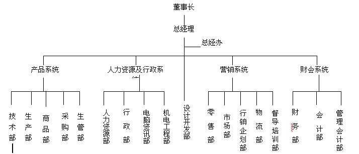 绩效考核体系如果不能够提升企业的竞争力,那么该考核体系的作用将是微乎其微的。目前很多人事经理在设计绩效考核体系时都能够把企业的战略目标和绩效考核联系起来,希望通过绩效考核来实现的企业的远大目标;在考核体系的定位上基本能够把企业的发展和员工的进步结合起来。这些都说明了人事经理们对绩效考核的认识已经越来越成熟了。但是如何设计一个能够有效提升企业竞争力的绩效考核体系并不是一件容易的事情,在这里只是提供一种方法,希望对大家有所帮助。 企业的竞争力是通过企业内部不同的职能部门发挥的作用体现出来的,显然不同的部门在不同的时期发挥作用的大小是有差异的,但不管差异有多大,每一个部门都是企业整体中不可分割的一部分,因此我们在设计绩效考核体系时就要立足于企业竞争力的分布状况,针对不同部门不同时期的作用来设计和推行绩效考核体系,做到密切配合企业不同发展时期战略目标的要求,通过绩效考核有效的提升企业的竞争力。下面以某民营企业的实际情况为例子进行分析,该企业的组织架构如下:
