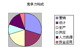 当对该企业进行绩效考核体系设计时,按一般的思路我们会根据每个系统的职责设计考核方案,但这种正常的思路由于没有很好对企业的竞争力分布状况进行分析,从而造成设计出来的绩效考核体系不能有效提升企业的竞争力。因此我们可以用另一种思路,先对整个企业当前的竞争力分布状况进行分析,再对每个职能部门的职责进行分析,最后才设计和推行能够提升当前企业竞争力特别是核心竞争力的绩效考核体系。 (一)经过分析,该企业的竞争力来源于六个部分的构成,分别是:设计、营销、生产、供应、人力资源和资金管理。这六个部分是不可分割的一个整体,但不同时期,每个部分发挥的作用大小会有变化。现阶段营销发挥的作用最大,接着是设计、生产、供应、人力资源与资金管理。如下图所示: