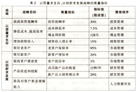 上图即为所谓的平衡计分卡。在业绩管理中采用平衡计分卡是一个复杂的系统工程,有兴趣的读者可以参考罗伯特·卡普兰、大卫·诺顿的著作《平衡计分卡》一书。 案例二的战略目标可以用以下指标进行衡量。如表2所示。
