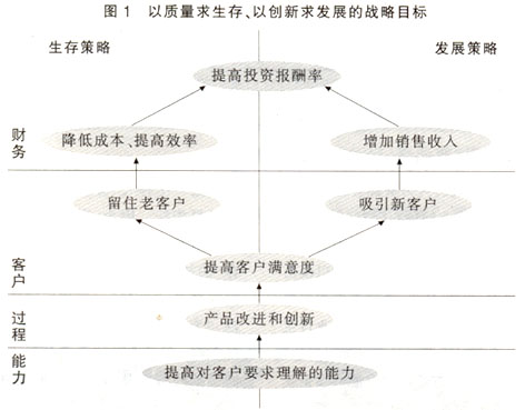 需要说明以下几点:首先,我们不但强调和控制了战略的结果,也强调和控制了战略的过程。不增加培训的投资,一段时间以后合格员工的数量会下降,过一段时间后客户的满意度也会下降,最后是销售收入和利润的下降。这里有这样的因果关系。从控制上,我们应该更加重视过程的指标,因为它是最终财务指标变化的“仪表”。其次,我们要选择合适的衡量指标对战略目标进行衡量。第三,对指标值的选取取决于企业的历史数据和管理部门的期望。最后,要把战略对管理程序变革的要求明确下来,才能够产生依据管理程序进行工作的基层员工的必要的行为,来推动战略的实现。 第二个案例——以质量求生存、以创新求发展 这个案例稍稍比第一个案例复杂一些。这个战略有两句话,四个关键词。 第一个战略叫做“以质量求生存”。 这里面有两个词,一个是“质量”,一个是“生存”。分别代表了过程指标和结果指标。因为,当我们问第一个问题,“我们成功地实现了‘以质量求生存'的战略,结果是什么”时,我们得到的答案是“生存”当我们问第二个问题,“为了成功地实现‘以质量求生存'的战略,必不可少的行动是什么”时,我们得到的答案是“质量”。因此,问题的答案就成为对“质量”和“生存”两个概念的理解。 同样的道理也适用于“以创新求发展”。 IS09000标准中关于质量术语的定义:产品的一组特性,满足客户要求的程度。定义中有两个要点,首先质量是以客户的要求、客户的满意作为标准的,不是以符合国家、行业、工厂的规范为标准的。第二个要点,产品的特性,我们经过长期的实践和研究,客户通常会在产品服务的特征——包括功能、一致性、价格、交期,产品/企业的形象,企业/人员与客户的关系等方面对产品提出明确的或潜在的要求。 所以我们的第一项工作就是与市场部门一起进行客户研究,采用座谈会和问卷调查的方法明确现有的产品系列的上述特性在客户心目中的重要程度及其排列顺序、明确我们的产品与竞争性产品在客户心目中的比较优势。从以上的研究中确定客户的价值主张,即给客户购买我们的而不是竞争对手的产品一个理由,从而为产品质量的改进(改进型新产品)和创新(创新型新产品)指明方向。 企业的一切创新最为重要的就是产品的创新。这个结论不需详细论述。有兴趣的读者可以参考彼得·杜拉克的著作《创新与企业家精神》一书。 关于“生存”,最重要的是现金。企业应该能够产生足够的现金用来支付变动成本,即生存的水平;如有剩余,可以支付固定成本;再有剩余,即为利润。 所以现金定义了“生存”,利润定义了“发展”。 我们的第二项工作就是与财务部门一起进行预算——包括损益预算、资产负债预算和现金流预算,详细定义生存和发展的财务指标。 总结上面的论述,我们发现这些战略目标有财务类的、客户类的、过程类的和能力类的,它们互为过程和结果(由图中的箭头符号表示)。如图1所示。