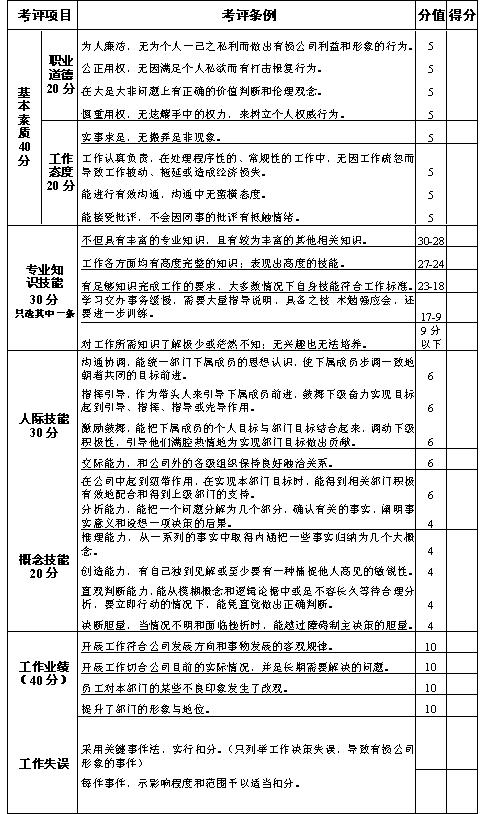 对绩效考核的理解 绩效考核是对员工的工作能力、专业知识、技能、工作业绩及工作态度等方面的评价,所以必须建立评价标准和尺度,来衡量员工是否胜任工作,并把绩效考核的结果和员工的岗位调整、薪资调整相联系,作为员工培训需求分析的主要依据,以此达到激励的目的。 考核思路 考核体系的设计是每个企业人力资源部工作的难点,通过考核考出差距,同时又起到激励作用,这是考核的理想效果。 考核体系的设计应建立在组织理论(组织的目标、组织结构的层次设置及岗位要求)和领导理论(需求层次理论、激励理论、人性假设理论)基础之上。只有如此,首先在考核设计的理论层次上得到正确保证,然后在考核技术上运用得当,我想不会出现考核通病——平均主义。 对于行政管理人员、工程技术人员的考核。由于他们的工作特点决定了这部分人员工作难以量化和程序化。所以考核的重点是如何激励他们能更出色的完成工作,考核内容不必也不可能是清晰化的,否则会遏制这些人员的创造性。 对这类人员的考核方案设计是建立在:他们是社会人,自我实现人性假设的理论基础上。具体考核是以加分为主,只有在工作中出现重大疏漏才给予扣分。 组织对基层、中层、高层管理人员的技能要求是不同的。基层管理人员主要需要的是技术、人际技能;中层管理人员需求的是技术、人际和一定的概念技能;高层管理人员特别需要较强的概念技能。所以针对不同管理层次人员的考核侧重点应有区别。 考核中应注意的几点: 1 不宜每月考核,考核的频度以一年一次为宜。每月考核只能对员工日常处理的事务进行考核,对工作能力、专业知识无法评价。 2 不宜把考核结果与工资直接挂钩。否则容易产生平均主义。 3 考核方法不主张用强制分配法。因为这种方法可能会出现人和人之间的比较,导致考核结果的失真。这时应从以下几方面考虑(1)考核者缺乏公正性或对被考核对象不熟。(2)考核表反映的信息不能被考核者理解,加强培训。(3)考核周期太频繁或对考核结果处理不当。(4)考核表在设计上存在问题。 4 不主张人人头上有考核。第一,考核不是一个简单的打分过程,而是对一个人进行全面的评价,所以要花费大量的时间、精力和人力。第二,企业80%的绩效由20%人控制,只要对20%人做出公正合理的评价,激发他们的积极性就能大幅度地提高企业绩效。 5 考核内容的设计应概括,忌列举式(忌仅仅是工作内容的列举)。 6 评价工作业绩时要注意区分个人的努力和集体努力。 7 提倡采用360度的考核方式,但应对考核对象给予不同的权重。直接上级最大,下级与同级次之。 以下是针对中层管理人员设计的考核表,及设计思路和对此表应用的几点说明。 1 本表是按照中层管理人员所需技能进行设计的,同时附加了基本素质,工作业绩和工作的失误项目。 2 基本素质是中层管理人员的任职基本资格,合格分为40分,低于40分即为无资格任职。所以在表术考核内容时用的是否定形式,只要有一次行为不符合某一条例要求的,此条得分为0分。但“基本素质”项不列入考核总分。 3 专业知识技能、人际技能、工作业绩、工作失误项目得分相加,合格分为60分。得分在59-50分者,在无人可胜任该职位情况下,可通过加强对不合格者培训,暂时任职,低于50分则应降级处理。 4 概念技能项目的考核是考察被考核者有无发展潜力。 5 企业只有保持长久而持续的创新,才能在竞争中赢得优势,所以要求企业各部门在工作中必须不断地创新,所以 “工作业绩”项目考核,对常规性的、程序性的日常事务工作不列入考核范围。把系统性的工作列入考核,就是对他们通过努地力工作而取得来之不易的成果的肯定和工作能力等各方面的肯定,由此使他们的尊重需要和自我实现需要得到满足,激励他们更努力地工作。同时也能考核出真正的优秀人才。 6 创新的过程风险与效益并存,为了鼓励创新,同时也为了规避“多做多错”现象的出现,对“工作失误”只把因工作决策失误,导致损害公司形象的行为列入考核。 7 专业知识技能、人际技能的高低,最终都会通过工作业绩反映出来,所以“工作业绩”项目的分值分配较高。