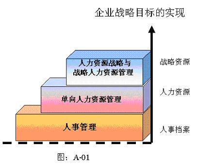 当人类正在向知识经济新时代迈进的时候,经济全球化的发展步伐也越来越快。中国经济不可避免地要面对经济全球化的挑战,这种挑战的直接表现,就是作为国民经济主体的企业之间的市场竞争将会空前激烈。如何在这种激烈竞争中生存下来且立于不败之地,企业必须建立自己的核心竞争力。 核心竞争力的概念是由管理学家布罗哈德和哈默在1990年的《哈佛商业评论》一篇论文中提出的:“核心竞争力是在组织内部经过整合了的知识和技能,尤其是关于怎样协调多种生产技能和整合不同技术的知识和技能。”这种核心竞争力必须是持续的超越竞争对手的能力。 那么具体什么是核心竞争力呢?是不同于它人的专利、品牌、产品和技术?还是企业的战略规划、灵活应变和团队协作?又或是产品质量、生产率、客户满意度?不错,这都应当属于企业的竞争力。当企业拥有以上所列一种或几种出色的能力时,它们的确可以帮助企业在激烈的竞争中占据一定的优势。但深入探究其本质,不管是专利的发明,品牌、产品和技术的创立,企业的战略规划、团队协作的运作,以及产品质量、生产率、客户满意度提高等等,这些科技、生产力的载体都是人才。有一位企业家说得好,“优秀的竞争团队是企业最核心的竞争力。因为,一个好的企业,如果管理团队出现失误,可以很快败掉;而一个亏损企业,则可能因为有一个好的企业家,从亏损变成盈利。” 显然,核心竞争力的关键是人,是各类专门人才汇集的团队。而当一个企业拥有独特的人力资源团队时,人力资源在企业战略的形成中将会成为决定力量。 在西方发达国家,从20世纪50年代至今,企业人力资源管理已经经历了三个发展阶段(图:A-01):