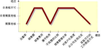 从图1可以看出,对推销员的绩效进行考核,管理者主要应考核以下5项指标:销售额及其增长率;销售费用;不良绩权比率;对客户及顾客的礼貌程度;从公司全局出发。 编制业绩考评标准。 绩效考核标准如同衡量员工绩效的一把尺子。业绩考评标准是针对考评指标体系而言的,由于业绩考评指标的差异性,其对应的考评标准肯定会存在区别。管理者通常应从岗位目标和岗位规范两个层面,编制业绩考评标准。
