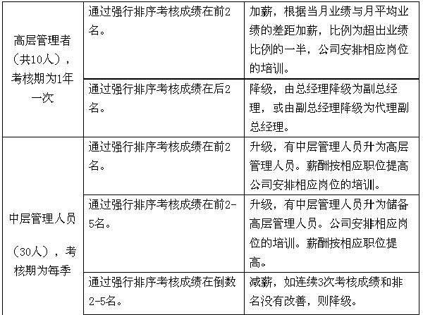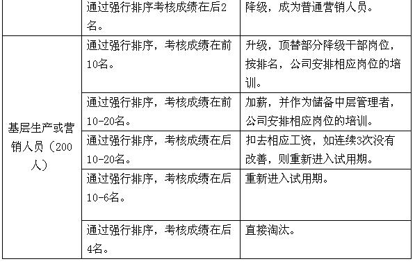 九、淘汰机制 人力资源部的最终考核得分将由上述两种考核得分汇总后得出。 公司不但要建立一套完整的绩效考核体系,还应该建立一套有效的淘汰机制,考核的最终目的是要让员工提高工作绩效,没有一套完善的奖惩措施和淘汰机制,是无法达到我们的预期目的的,那么绩效考核体系也就失去了其原有的意义。绩效考核应当与员工的薪酬挂钩,同时还应建立一套科学的淘汰机制,如末位淘汰制。 末位淘汰制有其可行性 建立严格的员工竞争机制,实行末位淘汰制,能给员工以压力,能在员工之间产生竞争气氛,有利于调动员工积极性,使公司更富有朝气和活力,更好地促进企业成长。 企业建立严格的员工竞争机制,实行末位淘汰制,从员工管理的角度讲,是一种强势管理。这种强势管理其实更是一种绩效管理,而所有绩效管理都不可能是完美的。 企业对员工的管理大致分为三个阶段: 第一阶段,人力成本阶段。企业认为员工是成本,缺乏对员工的尊重和信任。企业为了降低成本,多出效益,一味把员工工资压低,这种阶段是最原始的。 第二阶段,人力资源阶段。企业逐渐认识到员工自觉干和被动干所产生的效果是不一样的,开始重视培训,重视提高员工的能力。此阶段的企业会制定各种有关员工激励的制度,出台不同的考评办法。 第三阶段,人力资本阶段。企业认识到要把人当做资产,实现资产增值。这时员工的革新能力和创造能力是最重要的。有些企业正是有了人力资本,在缺乏资金的条件下,可以从很小的规模起步,经过十几年的努力成为世界上优秀的企业。 现在许多企业正在从第一阶段走向第二阶段,有的还没有走到。所以,对于一些企业来讲,实行严格的员工管理,如实行末位淘汰制还是有必要的。 末位淘汰制是把“双刃剑” 企业不能不考虑自己的实际情况,一味对员工实行宽松式的管理,当然过分强调严格管理也是有弊病的。末位淘汰制已经逐渐被国外知名企业所淘汰,因为这么做会使员工感到有压力,而且心情不畅。对于员工素质较高,能自觉自愿完成工作的企业不宜采用这种办法,而代之以人性化的管理方式。 末位淘汰制确实会给员工一定的压力,有压力就会有动力,一定程度上可以使公司人员实现优胜劣汰,一般市场人员考核指标很多,如果一个员工在考核期表现不太好的话,公司也不能马上辞退该员工,而必须具体分析原因: 是员工个人不努力,还是外部市场环境不景气。公司每个部门都有自己的考核办法,分量化和不可量化的部分,这些指标都具有可操作性和可衡量性。每次绩效考核完后都有一个评分,这个结果是为了找出员工在工作中的偏差,及时纠正。这是考核的最终目的。 强势管理,其实强调的是一种短期利益。企业应该认识到,推行强势管理,不是给员工以无情的压力,而是通过一套体系,形成企业内部的文化,目的是要帮助员工提高绩效。企业和员工之间应该是帮助和被帮助的关系。如果这套考核办法出来后,员工们感到人人自危,就失去了意义。 实行末位淘汰制应注意些什么? 末位淘汰制这种强势管理方式虽然有不足之处,但对市场竞争日趋激励的今天,对管理水平还不高的企业而言,有其可行性。强势管理对一些企业可能有效,如企业规模较大,管理层次较多,员工有人浮于事的现象,通过强势管理强行淘汰一些落后的员工。 当然,不管什么业绩管理,目的不是让员工流失,而是在组织的帮助下,每个员工都能完成业绩。其实每个员工的潜力是很大的,关键是怎么管理和开发。国内一些公司实行末位淘汰制,但只针对业务人员,被淘汰人数只有3~5人,淘汰下来的也不是让其回家,而是给换一个适合的岗位。这个企业这么做的效果是不错的,既调动了员工的积极性,又不会给整个企业形象造成什么负面影响。 实行这种办法关键要建立一套非常科学的考评制度,每次考评的标准一定要一致。另外,新来的员工要有一个熟悉和学习的过程,对他们的考评标准不能和老员工一样。 末位淘汰制要跟目标管理连在一起,目标一定要合理。首先目标要明确,并且这个目标应该是员工通过努力可以达到的,如果你定的目标让员工感到绝无可能,就不叫目标了。目标定得过高,员工可能会感到,“你这是让我走人”,马上产生消极情绪,会做出对企业不利的事情。其次,目标应是可行、具体和清晰的。在目标已定的情况下,企业管理者一定要经常帮助员工,如提供一些资源和条件,组织培训。如果最后由于员工自身的原因做不好,员工自己就会萌生退意,自然实现了优胜劣汰。员工由于自己原因而业绩不好被淘汰,大家都会理解和接受,不会产生什么负面影响。 对于末位淘汰制的淘汰比例,1%~2%就可以在企业内部起到有效激励的作用。如果定的比例过高,如20%,企业在员工管理上会出现各种问题,在人才市场的形象肯定会受到负面影响。 一个企业确实不能是一潭死水,必须有一个流动率,比较理想的流动率是5%。特别要注意,这5%里面核心员工的流动率是多少,核心员工就是给企业带来80%效益的那20%的员工,就是企业不可缺少的员工。这20%的员工不走,下面的员工流动率大一点也没有关系,但核心员工的流动率超过5%,就应当引起企业的重视,一定要弄清核心员工流动的原因是什么? 企业发展到一定阶段,还是应提倡弹性化和人性化的管理,就是尊敬员工式的管理。当然前提之一是在招聘时