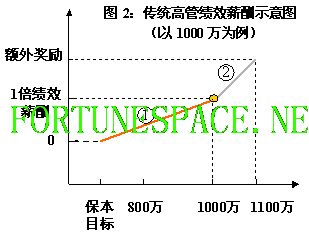 如图所示,传统方法中,高管实际所得绩效薪酬以是否完成业绩目标为标准分为两段。①段绩效薪酬通常以1倍绩效薪酬为基准计算,②段通常以销售额、利润额、净利润等为基准计算奖金。而且,一般情况下,企业为强化激励,后者的奖励幅度要比前者大许多。 问题出来了,由于业绩目标值硬生生将两种完全不同的奖励方式予以分离,前后激励效果落差较大,导致企业和高管在业绩目标值的设定上都寸土不让,即便企业挟资源优势最后强行设立一个业绩目标值,在大多数高管眼里,也是过高不合理的,故而年终时必然发生高管奋起“控诉”企业年初业绩目标制定不合理的事件,而企业通常也只能用红包或辛苦费的方式进行补偿。 企业为什么总喜欢将业绩目标值定得很高(通常是过高)?最明显的一个原因是高目标会对高管有更强的驱动力,但我们知道驱动力最强的应该是“不仅高而且够得着”的目标;第二个原因是高目标看起来比较宏伟,通常在国有企业比较容易发生;剩下一个原因就是企业怕目标一旦低了,高管会过于轻易的完成目标。奖励高管多少倒在其次,重要的是怕内部引发薪酬公平性问题,打击其他高管工作的积极性。因为即便在理想情况下,高管年度业绩指标也无法预先准确制定,尤其对于那些属于新兴市场、业务不稳定、投机性强、受政策或市场环境影响较大的行业,业绩指标的实现与否并不能完全代表高管个人的素质和能力,比较典型的有外贸、物流、能源或金属等,新华信这类咨询行业也是其中之一,企业内部开辟新业务、新市场时也是如此。 而高管希望将业绩目标定低的原因很简单,当然是低些容易完成,高了拿不到钱;或者进一步说,目标越低,就越容易拿到高激励段的奖金。如此一来,这一年度业绩指标就成了众矢之的,成了两方争抢的桥头堡。当然通常的结果都是企业大占上风,定下一个很高、而且不太容易实现的业绩指标。 宽带绩效就是针对这类情况设计的,它不仅能解决“因高管完成业绩指标获得不合理奖励,企业内部引发的薪酬不公平”问题,也能使“高管在完成业绩指标时,获得比传统绩效考核更高的薪酬激励”,而且操作简便。 宽带绩效的应用 宽带绩效就是将单一业绩指标变为宽带,在实际操作中,我们通常只要设定两级指标。比如原业绩指标为1000万(事实上大家都知道1000万过高,正常情况下应该为800万),那么现在将业绩指标设为800万和1000万两级,我们可将800万称为一级业绩指标,1000万为二级业绩指标。下面我们就以上述指标为例来说明这一方法的应用。 方法的重点在于一旦高管年终完成800万,企业将先把高管90%或95%的绩效薪酬补足,用于鼓励高管先完成800万的一级业绩指标,而800万至1000万之间的绩效依旧以1倍绩效薪酬为基准继续计算。如下图: