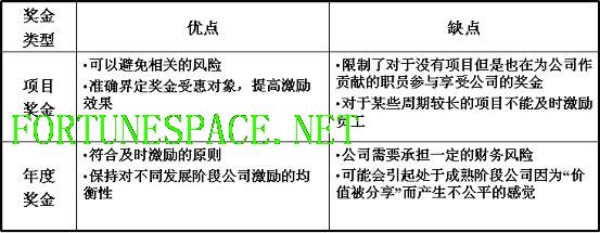 针对房地产行业内项目制的特点,顾问为团队设计了年度考核与项目考核两种考核方法。前者具有考核持续稳定、兼顾不同地区公司差异的优势;后者体现了房地产行业的项目特点,有利于避免短期行为。 在年度考核上,根据香江集团各地区公司所处的发展阶段不同的实际情况和房地产行业的特点,顾问将各地区公司分为进入阶段、开拓阶段、成熟阶段,并制定了相应的考核标准。对于进入阶段的公司,考核指标更偏向于企业的创新成长;而当企业进入开拓和成熟阶段后,财务方面的考核则更为重要。如表2所示。在项目考核上,由于各地区公司每个地产项目的周期过程特征基本相似,因此每个项目的考核标准是相同的。 表2:不同阶段公司的考核指标比例 公司所处阶段 财务 市场 内部管理 创新成长 进入阶段 30% 10% 20% 40% 开拓阶段 50% 10% 15% 25% 成熟阶段 55% 10% 20% 15% 2、设计薪酬奖励 顾问团队设计的薪酬奖励是指企业在获得理想或者额外效益后所支付的薪金,用以奖励那些为企业获得额外收益做出贡献的职员。一方面可以实现员工参与分享企业经营成果,同时激励员工为企业做出更大的贡献。 在设计之初,顾问首先明确了奖金核算的三大原则:奖金和经营业绩高相关的原则;地区公司之间保持相对均衡的原则;年度之间保持相对稳定的原则。为了能够与地区分公司的考核保持一致,香江集团的奖金发放同时采用年度奖金和项目奖金两种方式,以综合两种方式的优势。如表3所示。 表3:年度奖金与项目奖金的优缺点