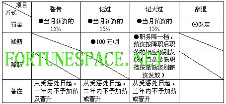 第十一条:惩处程序 1、员工违纪后,由所在部门依据具体违纪事项和本条例提出处理意见,报人力资源部; 2、人力资源部审核后,报公司领导层决议后生效; 3、惩处事宜记入员工档案,并予公告; 第四章:奖惩转换办法 (一)员工之奖励两年期间,以嘉奖3次等于记功1次,记功3次等于记大功1次,即第三次受相同奖励项目时,第三次奖励方式标准为高一级的奖励项目的奖励方式标准。 (二)员工之惩处两年期间,以警告2次等于记过1次,记过2次等于记大过1次,记大过两次应予开除。即第二次受相同惩处项目时,第二次惩处方式标准为高一级的惩处项目的惩处方式标准。 (三)员工奖惩转换,本规定所称嘉奖与警告、记功与记过、记大功与记大过在受奖惩日起一年内可以相互抵消。 (四)员工在受惩处之日起若在一定时间内表现良好的可撤销处罚,删除受惩档案记录,但原则上不恢复原来的薪资与职务,从撤销日起恢复享有加薪及晋升的权利;撤销警告处分的考察期至少为半年,记过处分至少为一年,记大过处分至少为1年半时间。 (五)惩处撤销程序类同惩处程序1、2、3项。 第五章:附则 1、其他以本公司或员工有利的行为,具有事实证明者,亦可申报奖励。 2、其他违反本公司各项规章制度,应予惩诫事项者,应分别予以惩处。 |