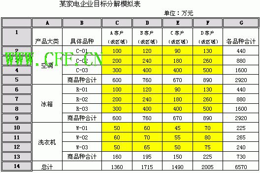 如按照此测算方法,江苏省厨卫电器三机行业市场总量为9.1亿元,而广东则为14.3亿元。同样按照此方法可精算到地级市和县级市。 当然市场容量的测算针对不同的行业有不同的经验公式和方法,另外尽管有这些经验公式,但针对不同的市场仍需要进行不断的求证和修正。 目标分解工具之一 目标的制定与分解并不会简单的一次成型,往往需要不断的反复权衡与调整才能最终确定。尤其是当公司的区域市场、产品品种众多的时候,借助计算机等电算化工具才能有更好的效果。以下是采用excel 运算表来进行目标模拟分解与运算的一种方法。