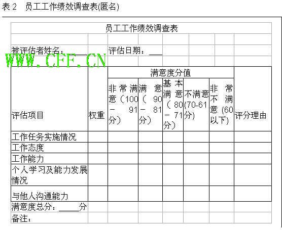 表1 绩效指导记录表 3.2绩效评估方案 以移动运营商普遍设立的市场部为例,阐述新的绩效评估流程。为提高绩效评估的全面和客观性,笔者在绩效评估流程中新增了员工工作绩效调查流程。 在年底绩效考核时,人力资源部将工作绩效调查表(见表2)下发到公司市场部,以及与市场部有工作联系的部门、外单位和销售渠道商,要求被考评者的下属、同事和有工作联系的人员对被调查者工作进行满意度打分,而且在评估表中的打分理由项中要求填写事实依据。在这里,调查表填写采取匿名形式,避免人情分和打击报复情况的出现。评估结束后,各评估者将评估结果交公司人力资源部。然后人力资源部下发本年度的绩效评估表,根据市场部本年度绩效指标完成情况,以上级主管评价为主,员工自评为辅,对员工工作目标完成和能力发展进行考核评估,并结合工作绩效调查表的评估结果计算出每名员工的最终绩效得分,形成员工绩效评估表,交市场部主任核准。