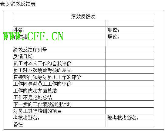 3.3绩效反馈方案 在年底绩效考核结束后,应进行有被评估者、工作同事、上级主管等参与的绩效反馈会。首先由上级主管进行被评估者年度绩效情况的陈述,并提供相应的事实依据。接下来让被考评者对自己的绩效评估结果进行评价,然后再由部门主管帮助被评估者分析问题症结所在,双方努力达成对评估结果的一致看法。找到问题产生的原因后,双方共同协商出一个解决的办法,制定出绩效改进计划。此计划中,双方必须落实绩效改进行动方案,时限,监督人等等,如果需要进行业务或能力培训,上级主管还应制定详细的培训方案,以使绩效改进方案落到实处。最后,反馈各方填写绩效反馈表(见表3),以书面形式记录本次反馈过程的成果,交部门主管备案,以便管理者随时监督下属绩效改善情况。