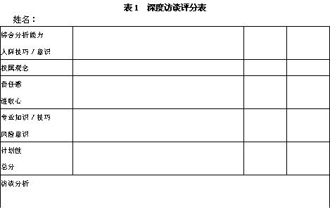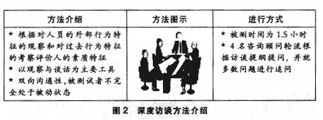二、营销人员素质测评方法 本文对S企业营销人员素质测评采用深度访谈法。这种方法的信度和效度较高,基本能反映被测人员的素质状况。深度访谈就是测评者与被测评者直接交谈,了解被测评者素质状况、专业知识、工作能力与个性特征等情况,从而完成对被测评者适应职位的可能性和发展潜力的评价方法。 1.深度访谈方法介绍如图2所示。