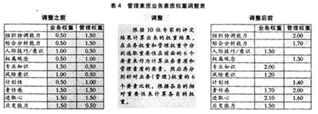 估计时间:8分钟 (11)国外的一个汽车厂家所产汽车原定的售价是6000美金一台,实际销售时只卖到4000美金,为什么? 测评要点:综合分析能力、专业知识 估计时间:5分钟 (12)如果你所在地区的汽车在降价促销,而S公司总部要求保持其市场定位,你又要完成指标,你该怎么办? 测评要点:权属观念、专业知识、计划性 估计时间:5分钟 4.深度访谈结束后,测评者填写评分表见表1所示。 5.深度访谈总结 (1)访谈历时两周半,51名被测人分为9个小组,前两周为每周3组,每组6人,每半天测试 2人(测试时间为每周一、三、五全天和二、四、六上午),最后3组为每组5人,从第三周开始,周一至周三每天上午测试2人,下午测试3人。 (2)访谈进行顺利,被测人员绝大多数都能较积极配合回答问题,和主试人进行较好的双向交流。对极少数配合不太积极者,主试人通过各种类型问题的交叉提问考察了所要测评的因素。 总结:深度访谈进行顺利,测评者在评价中剔除年龄、经历、经验影响对被测评者各项因素进行独立客观的评判,测评的结果是可信的。 三、营销人员素质测评权重分配方法 对S企业营销人员进行深度访谈测评时,主要是从管理素质和业务素质两方面进行的,管理素质和业务素质都包括10种要素,即组织协调能力、综合分析能力、人际技巧/意识、权属观念、专业知识、风险意识、计划性、责任感、进取心、应变能力,只是它们各自的权重不同。为避免相关性的影响,管理素质和业务素质只对权重大的前6个要素进行计算。具体计算方法见表2、表3、表 4所示。 根据表2和表3的计算对权重进行调整确定最终权重见表4。 为避免相关性的影响,对管理素质和业务素质各取权重大的前6个因素进行最后分析。