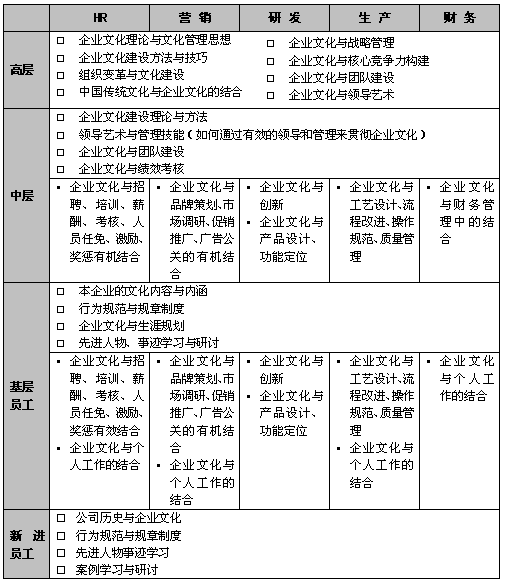 海尔是让我们很多人羡慕的企业,他的“激活休克鱼”成为哈佛商学院的经典案例。这种观念其实就是企业文化,张瑞敏坚信“观念一变天地宽”,因此,海尔对其他公司的兼并就是将其强有力的文化注入进去,进行彻底的培训和“洗脑”,取得了巨大的成功。企业文化是以价值观塑造为核心,提升企业绩效和管理水平为目的,优秀的企业文化必须包涵两个要素:一是核心理念是否正确、清晰与卓越,二是这种理念是否能够宣传贯彻下去,让每个员工认同并且体现在自己的实际工作中。很多企业其实并不缺乏优秀的文化理念,比如“以人为本、追求卓越、诚信、创新”等,核心理念在不同企业间没有本质差别,只是体现在工作方法与行为上,却有本质的区别,这就需要通过构建完整的培训体系来使全体员工了解企业理念是什么,如何将企业理念与自己的实际工作结合起来。 国内很多企业也越来越重视企业文化培训工作,但往往不得要领,主要表现在:一、很多企业在进行文化培训时,往往是想起来才做,或者是有了问题才做,也就是“救火式”的培训,没有系统规划;二是没有针对不同层级和职能的人员,“大锅烩”式的企业文化培训;三是培训形式过于单一,没有采取案例学习、研讨、活动都培训方式的综合运用,忽略了企业管理者的学习特性,“学习式”的企业文化培训。 根据笔者对企业进行培训和咨询的经验,建议企业可从内容、形式和组织三个方面入手进行企业文化培训体系的规划。 一、内容要求层次性。 很多企业在进行文化培训时,恨不得所有的人都来听,有时一个教室有一两百人,企业各个层级和部门的人都有,讲师也是“眉毛胡子一把抓”,不分对象,跟谁都是一个内容,这样往往没有好的效果,在企业进行文化建设的初期,需要对企业文化理论有基本了解的时候,可采用这样的培训方法,但如果进行深入的文化建设,显然这种方法是不够科学的。笔者认为,在进行企业文化培训时,需要针对不同层级和职能的人,设计不同的培训内容和形式。比如著名的HP公司,他们的培训非常的优秀,从员工进行公司开始,就要接受各种不同内容的培训,基本的思路是根据员工的工作内容和成熟度,培训过程是由“硬”到软“的,课程从技术业务知识到沟通技巧再到文化、思维,是一个不断深化的过程。 从企业的层级别来看,高层需要了解企业文化的本质、与传统文化的关系、与战略、核心竞争力的关系、如何实施文化变革等内容;中层的侧重点在于如何在领导下属、实施考核、团队建设中体现企业文化,即企业文化与管理技能的结合,没有优秀的领导技能就无法传扬公司的文化;而基层人员则更需要理解本公司的企业文化理念,以及如何把在工作中体现出企业文化;新进人员需要认识公司的历史和文化、先进人物事迹、行为规范等。由此可见,如果没有针对性,实行“大锅烩”式的企业文化培训,往往没有效果。 从企业职能别来看,不同部门对企业文化的需求也不一样,营销部门需要了解企业文化与品牌建设、促销推广、广告公关等内容;人力资源部门需要了解企业文化与招聘、培训、考核、薪酬、激励、奖惩、任免等工作的有机结合;生产部门需要了解企业文化如何体现在工艺设计、质量控制、流程改造、操作规范等环节;财务部门则需要了解企业文化在投融资、预决算管理、成本控制等方面的应用;其他部门的文化培训也应该有不同的侧重点。 总的来说,如果从层级别和职能别两个维度来看企业文化培训的内容,可参考下表:
