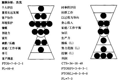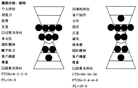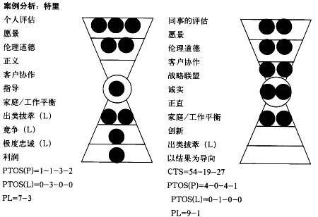 同事对优点的评估:1、平易近人、开放、诚实;2、聪慧、平衡、具有团队精神。 同事对缺点的评估:有时过于敏感。 同事的建议:做决策时不要优柔寡断,行动要更迅速。 特里需要努力摆脱他的恐惧,这种恐惧使他具有强烈的竞争性,使他希望自己的锋芒超过其他的团队成员。这种恐惧带来的行为削弱了他融入团队的能力。同时,他需要培养他的情商技能,以便更积极地与管理团队的其他成员进行交往。特里应考虑第一和第二阶段的领导能力发展项目,以便为他较强的第六、第七层次的领导技能进行补充。 与特里一样,帕特也有5项价值是一致的。她对自己的看法与同事的看法非常接近,她在工作中表现出的是真实的个人。她具有非常强的第五层次的领导风格。她的价值中有超过 40%的价值位于合作者的意识层次。帕特还具有良好的团队建设技能(第四层次)。她的同事认为她非常重视客户满意和协作。人们认为她不善于建立战略联盟(第六层次),第七层次的价值也较少。她的同事认为帕特有时过于敏感,他们希望她在进行决策时更为果断。帕特的另一个问题是缺少第一层次的价值,她需要更多地关注她的工作与企业利润之间的联系。 帕特的CTS指数是60—16—24,这个指数非常强。如果能再增加一些变革层次的价值,减少一些个人利益层次的价值,这个指数会更强。变革层次的得分是16,这可能与帕特在她的团队成员向她提出意见时表现出的敏感有关。敏感是由未摆脱的恐惧所致。 帕特的同事对她的PTOS(P)指数的评估(3—3—4一O)与她自己的评估(4—3—3—O)十分接近。这是一个十分平衡的指数,所有的价值都是良性价值。如果能够减少企业价值的数量,增加社会价值的数量,这一指数将会得到进一步改善。