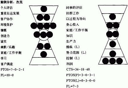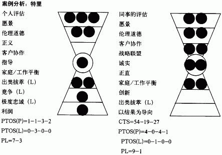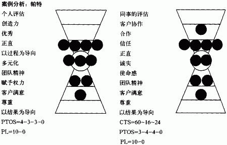 同事对优点的评估:1、明确、智慧和知识;2、愿景。 同事对缺点的评估:1、缺乏与同事的沟通;2、缺乏团队建设技能。 同事的建设:多倾听同事的需求,多与同事沟通,减少与老板的沟通,减少个人野心。 领导能力评估案例分析 以下三个案例分析说明了领导评估工具的使用。特里、帕特和杰克是一支10人管理团队的成员。团队的每个成员都为他们提供了反馈。自我评估的结果列在左侧一栏,9名同事的反馈结果列在右侧一栏。每个价值,根据其是否支持或阻碍有凝聚力的企业文化的建设,而被分为良性的(P)或带有局限性的(L)价值。认为此人具有某种价值和行为的同事的数量列在右侧一栏中。表中只显示了位于前10位的价值和行为。中间一栏显示的是个人自我评估与同事对自己的评估相一致的地方。 在特里对自己的管理价值和行为的评估与他的同事的评估中有5项是一致的,表明特里对自己的认识与同事的看法相似。这通常是真实和自知的表现。特里和他的同事都认为他的意识分布是平衡的。他还表现出较强的客户协作技能(第六层次),关注愿景和伦理道德(第七层次)。特里最需要努力提高的领导素质是团队协作 (第四层次)和团体精神(第五层次)。他的同事希望他更多地进行沟通并倾听他们的需求,希望他更多地参与集体的行动,而不是过度关注个人的“出类拔萃”。特里潜意识地知道他不善于自己内在的修养,因为他在自我评估中没有列出任何第五层次的价值。同时,他还坦率地承认他喜欢竞争,希望出类拔萃,并且极度忠诚。他的忠诚是对老板的忠诚,而不是对团队的忠诚。 特里的CTS指数是54—19—27,这一指数量度的是较高的三个意识层次(公共利益)、中间层次(变革)和较低的三个意识层次(个人利益)的价值分别所占的比例。特里的CTS指数显示:他的各个方面都不错。如果加强对变革层次的关注,这一指数还可得到改善。图表还显示,他具有第六和第七层次的领导素质(伦理道德、愿景、正义、客户协作和战略联盟)以及第五和第四层次的个人素质 (诚实、正直、创新和平衡),但他缺少第五和第四层次的团体和团队建设的价值。 特里的同事对他的PTOS(P)指数的评估是4—O—4—1,这一指数量度的是前10今价值中,个人、团队、企业和社会价值的数量。他们认为他具有 4个个人价值、4个企业价值和1个社会价值。他们还认为他具有一个带有局限性的团队价值——出类拔萃。特里对自己评估的PTOS(P)指数是1—1—3—2,PTOS(L)指数是0—3—0—0。他为自己确定的4个团队价值中,有3个带有局限性。
