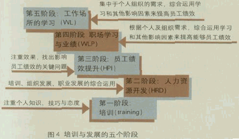 该模型中的核心部分是工作本身,如果希望一个工作岗位产生绩效,就必须确保在这个工作岗位上的人知道自己在做什么,所从事工作是什么并且能胜任。如果他根本不知道自己要做什么,或者不懂得怎样做,那就没有理由期望他会贡献绩效。企业中的培训工作针对的也就是这个层面,要保证每个工作岗位的人都有相应的工作技能。 第二个层面是人的层面,员工懂得怎样从事相应的工作,但如何让他保持高昂的士气、激情与战斗力,积极主动地做更多工作,就需要人性化的管理,运用激励手段,引发员工心中的渴望,运用赞赏、沟通、尊重、信任等价值观来影响员工。 第三个层面是工作场所,包含了各个职能部分、任务小组、项目小组等。只要他们在一起共同为同一个主要结果领域服务,就可以称之为工作场所。现代管理中,工作场所的学习与绩效已经变得越来越重要,这里就有对团队学习概念的运用。如果发挥工作场所中团队的合力产生出更大的创造力,就会有更高的绩效。 第四个层面讲的是工作环境,其实就是组织文化,在良好的环境中,人们能够主动积极地共同思考讨论革新方案。新的思想不断涌现,不同的观点及想法有发表的机会。这种组织氛围给学习与绩效带来极大发展空间。 从简单的绩效模型出发,可以看到现代管理实践中,传统的管理方式虽然仍存在,但已越来越淡化成了必备条件。比如说员工的工作能力及态度,以前可能是人力资源工作特别是培训工作的重点,但现在已经成为员工必须具备的要素。而以往重视不够的领域如工作场所的绩效以及工作环境的改善以帮助绩效的最大化,现在则变得越来越重要。特别是工作场所的学习与绩效问题,目前在美国被称为第四代的培训与发展。 第一所段:培训(Training)。这一阶段的中心即培训,通过为个人提供其顺利完成工作所需的知识、技能和态度而改变个人; 第二阶段:人力资源开发(HRD),对培训、组织发展和职业生涯发展的整合运用;通过改变现在(借助培训)和未来(借助职业开发)的行为,HRD改变了个人,也改变了工作环境。 第三阶段:员工绩效提升(HPI)。员工绩效提升是识别员工绩效问题之根源、并且找到消除这些原因之解决办法或干预措施的过程;HPI关心的是效果,而不是活动;HPI利用任何或一切方式去取得效果; 第四阶段:职场学习与绩效(WLP),为了提升个人和组织绩效、满足个人和组织需求,面对学习和其他干预措施综合运用。WLP采用绩效分析和解决个人、群体和组织绩效问题的一整套系统流程,通过对员工、道德等问题钓协调。在组织内创造积极而进步的变革。 第五阶段:工作场所学习者(WL),通过学习,而不是培训来改变个人;学习是实现绩效提升目的一种手段;对学习的关注则意味着,对培训者、人力资源开发专职人员、员工绩效提升从业者或职场学习者的全新角色定位。 后培训与发展时代的人力资源管理 所谓后培训与发展时代讲的就是工作场所的学习与绩效(WLP)以及工作场所学习者(WL)的阶段。笔者认为他们最大的不同就是个人学习与团队学习。工作场所的学习与绩效(WLP)是借助员工绩效提升 (HPI),赋予人力资源开发(HRD)新的内涵。工作场所的学习与绩效强调把学习作为在组织环境下提升工作绩效的一个工具,它与培训不同的是,培训是作用于人,而学习是通过人产生作用。 所以在后培训与发展时代,人力资源工作的重点在于如何创造一个良好的团队学习平台,如何让企业中的员工意识到绩效的产生及最大化与团队智慧息息相关,如何让员工们掌握团队学习的技巧。 由于许多组织对于团队运作或群体动态都有长足的经验,因此许多团队都认为他们已经实践团队学习很久了。然而,与团队运作不一样的是,团队学习的修炼不是为了改善团队成员的技巧,甚至也不是改善沟通技巧。多年来我们都用“整体搭配(alignment)”而不是“同意或一致(agreement)”的概念来掌握团队学习的精髓。“整体搭配”的意思是“发挥整体的作用”,能够整体搭配,也就是说由于团队成员了解彼此的感觉和想法.因此能借助完善的协调和一体的感觉,以能够发挥高效的新方式,来提升团队思考和行动的能力。当我们逐渐彼此合作时,他们不需要忽视或隐藏彼此之间的分歧。他们有能力运用彼此之间的分歧,来丰富群体对事物的理解。 团队学习最有效的方法来自于两种对话的形式:深度汇谈(dialogue)和有技巧的讨论(skillful discussion)。 深度汇谈的基本要素有如下几点: 邀请:开始建立大容器。大家必须有参与的机会,并且了解他们的抗拒和恐惧.并使之得到妥善的回应。 建设性聆听:充分聆听的意思是要密切注意别人的言外之意,不但要聆听“声音”,还要关注到发言者的本质,不只要倾听对方的知识,还要注意到他是什么人。你的耳朵随着声音的节奏起舞,但是耳中所闻要比心中所想速度慢得多。建设性的聆听是在你的内心保持深度静默的艺术。因此你可以配合耳朵聆听的自然速度,放慢心智的活动,并且充分聆听言语中隐藏的含义。 自我观察:当我们观察到主宰我们世界观的思维时,我们就展开了自我改造的历程。许多深度汇谈的技巧(例如沉默)都和营造一个安静的环境让我们能观察自己和团队的思维有关。一旦看清了自我,情况就会慢慢转变。