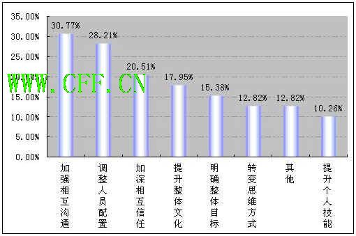 3.团队素质能满足工作要求,但总体提升缓慢 据统计资料显示,60%员工认为××公司团队的素质与优秀企业相比,总体水平不差上下,25%认为略差,15%认为较差。 在员工与团队合作的信心方面,30%员工认为团队正向有利发现发展,35%认为没有变化,20%保持观望状态。 在团队素质的提升方面,15%员工非常认同我们的团队正在进步,35%基本认同这一事实,40%表示沉默,10%表示不认同。 五.员工个人技能与专业知识 1.员工专业技能的自我评价 员工普遍认为,在实际工作中自身的专业技能比较满意,这一比例高达60%,仅有5%左右的员工认为自己的技能相当完备,与此同时,20%员工对自身知识与技能表示了不满,希望在以后的工作中逐步提升。 但在专业技能转化方面,这一比例有所下降,65%员工认为自身的技能基本发挥,30%员工认为没有完全发挥,可见专业素质在向业绩转化上并不十分理想,员工的潜能和能力有待于进一步开发。 2.期望以后改进方面 在对公司长期发展建议方面,员工认为关键点在于加强相互沟通、调整人员配置等方面,而提升个人素质的支持度最低(约11.76%),具体见下图:
