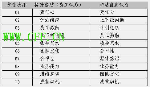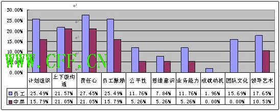 3.中层管理人员急需提升的方面 根据调查数据显示,样本员工认为,在以后的工作中,中层管理人员需在以下几个方面提升个人素质,依次为:责任心、计划组织、员工激励、上下级沟通、领导艺术、团队文化、公平性、业务能力、思维意识、成就动机。 而据中层管理人员的调查显示,则依次为:责任心、上下级沟通、计划组织、员工激励、领导艺术、公平性、思维意识、业务能力,团队文化、成就动机。