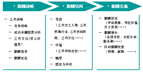 随着商业竞争日益的加剧、从制造业时代到知识经济时代的转变和劳动力市场流动性的增加,企业间人才争夺也愈来愈烈,如何吸引、激励和保留企业核心人才对薪酬管理提出了时代特征的挑战。薪酬管理是一门科学,更是一门艺术,它是企业的信号系统,直接影响着对企业最核心资源——“人才”的管理,那么薪酬管理包含那些方面的内容呢? 总体来说,薪酬管理可以概括以下三方面内容: 1、战略-确定组织薪酬战略 2、设计-设计组织薪酬结构 3、实施-全面实施薪酬管理
