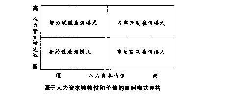 根据战略管理中资源理论的观点,人力资本是企业持续竞争优势的源泉,企业需要控制的人力资本越多,企业发展的空间越大。但在实际的人力资源管理中企业不可能无限制地配置太多的人力资本,一般而言,人力资本价值越高,所要求的工资水平越高,企业的人工成本压力越大。现代社会中组织同时面临着生产效率和经营灵活性的压力,除了使用长期雇佣的全职员工外,很多企业也很依赖于外部员工和外部智力等,特别是随着组织将大量的生产活动外包,组织合作伙伴中的人力资本对组织也产生重大的影响。劳动力人力资本的特定性因素影响着组织采用不同的雇佣模式,它们又共同影响到企业的薪酬制度设计。 一、人力资源是企业竞争优势的源泉:人力资本的特定性 现代理论认为作为持续竞争优势源泉的资源必须具备四个特征:有价值、独特性、不可模仿性和不可替代性,因此正是人力资本的企业特定性使人力资源成为持续竞争优势的源泉。 人力资本投资的方式包括正规的学校教育和在职培训等,前者产生的人力资本是一般性的人力资本,后者产生的人力资本则包括一般性和特定性两种形式,所以企业的培训或人力资本投资可以分为一般性人力资本的培训和特定性人力资本的培训。由于培训形成的人力资本增值是嵌入在员工个体之中,员工又天然地具有流动的风险,所以一般性人力资本培训的成本通常由员工个人承担,而且员工个人享受人力资本增值的收益;一般情况下企业与员工共同分担特定性培训的费用,并分享特定性人力资本增值之后收益的增加。特定性的人力资本更多的是通过长期的工作岗位实践积累而成,在企业内长期工作的员工比从劳动力市场中刚招聘的员工具有更高程度的企业特定性。 人力资本特定性的程度还影响到员工的雇佣方式。企业特定性越强的员工,对企业的作用更明显,对企业的依附性也越强。所以当员工具有高度的特定性人力资本,或企业的运作需要员工人力资本具有高度的特定性时,企业一般会采用内部长期雇佣的模式;而当人力资本的企业特定性程度比较低的时候,员工任职资格的社会化程度较高,企业可以和员工保持比较松散的关系,以提高雇佣的灵活性。 二、雇佣模式的多样性:基于人力资本特定性和价值的分析 根据人力资本的特定性和在企业中的相对价值,组织的雇佣模式一般包括四种类型:内部开发、市场获取、合约性雇佣以及智力联盟模式,如图。
