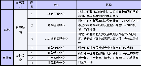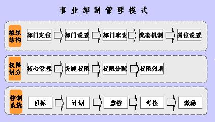 1、 重大决策权:即总部对各个事业部在战略方向、重大战略性项目等重大经营管理问题上的决策权力。 2、 合理监控权:即总部对各个事业部合理的监控权,主要体现在财务监控与业务监控(业务监控权,指对业务经营状况的知情权、整体经营业绩的考核权等)。 3、 高层人事权:即总部对各个事业部高层管理人员(包括事业部的财务人员)的任免权、奖惩激励权等。 该三种权力不仅是总部所拥有的核心权力,而且是总部所拥有的最底线的权力。在这样的前提条件下,总部对事业部的管理就不会出现失控的问题。 事业部制管理模式设计的三大核心――组织结构、权限划分、控制体系 通过实践总结,我们认为设计事业部制管理模式需要建立三个核心内容――组织结构、权限划分以及控制体系。(事业部制管理模式如图1所示) 所谓组织结构(设计),即设计总部、事业部组织结构,包括部门构成、确定部门职责以及相关岗位设计。 所谓权限划分,即具体集权和分权的内容,是指对具体的管理内容,总部与事业部各自行使的权力。 所谓控制体系,是指总部对各事业部管理进行有效计划、监督、控制与激励的管理体系。 组织结构是设计管理模式的基础工作,它不仅是权限实现的载体,而且是控制体系得以顺畅执行的平台;管理模式本质上界定清楚总部与事业部之间的权限划分,因此权限划分是整个管理模式得以成功的保障;控制体系则是管理模式内容的核心。 图1 事业部制管理模式图 1、 组织结构设计 首先,明确总部和事业部各自的定位。 事业部制管理模式对总部和事业部各自的定位体现出“集中决策、分散经营”的原则。具体定位参见下表2。 需要说明的是,战略管理中心、财务控制中心和人力资源管理中心分别是总部“三大权力”的具体体现,此处不赘述。经营协调中心是总部在各个事业部之间充当协调人和服务者的角色,这样降低了事业部之间协调成本,实现公司资源的充分利用。 表2 事业部制管理模式下的总部/事业部定位