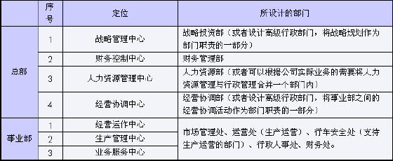 其次,根据定位设计相应的部门。 在明确总部与事业部的定位后,需要设计有关的部门实现职责定位。这里以案例中的A集团为例,设计相关的部门。具体内容参见表3。