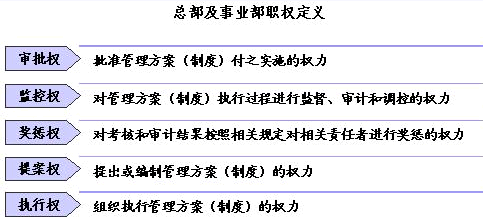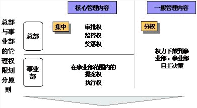图6-3 总部及事业部职权定义 其中,审批权、监控权和奖惩权属于总部集权的体现,而提案权、执行权则体现事业部所拥有的权限内容。 第三步,管理权限与具体权限进行匹配,并最后编制企业使用的管理权限表。 其中,对于所列出的核心管理内容,需要由总部进行集权管理。而对于一般的管理内容,比如产品管理、定价、人力资源管理、行政事务等等则在分权的范围之内,本文就不一一列述。总体来说,总部和事业部之间的集权与分权框架如图4所示: