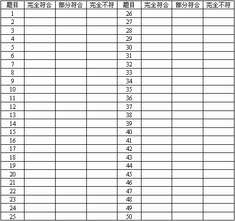 一、完整测量表 这是一份帮助你了解自己创造力的练习。在下列句子中,如果你发现某些句子所描述的情形很适合你,则请在题后的表格里“完全符合”的选项内打钩;若有些句子只是在部分时候适合你,则在“部分适合”的选项内打钩;如果有些句子对你来说,根本是不可能的,则在“完全不符”的选项内打钩。 注意: 1.每一题都要做,不要花太多时间去想。 2.所有题目都没有“正确答案”,凭你读完每一句的第一印象作答。 3.虽然没有时间限制,但尽可能地争取以较快的速度完成,愈快愈好。 4.切记:凭你自己的真实感受作答,在最符合自己的选项内打钩。 5.每一题只能打一个钩。 1.在学校里,我喜欢试着对事情或问题作猜测,即使不一定猜对也无所谓。 2.我喜欢仔细观察我没有见过的东西,以了解详细的情形。 3.我喜欢变化多端和富有想象力的故事。 4.画图时我喜欢临摹别人的作品。 5.我喜欢利用旧报纸、旧日历及旧罐头盒等废物来做成各种好玩的东西。 6.我喜欢幻想一些我想知道或想做的事。 7.如果事情不能一次完成,我会继续尝试,直到完成为止。 8.做功课时我喜欢参考各种不同的资料,以便得到多方面的了解。 9.我喜欢用相同的方法做事情,不喜欢去找其他新的方法。 10.我喜欢探究事情的真相。 11.我喜欢做许多新鲜的事。 12.我不喜欢交新朋友。 13.我喜欢想一些不会在我身上发生的事。 14.我喜欢想象有一天能成为艺术家、音乐家或诗人。 15.我会因为一些令人兴奋的念头而忘了其他的事。 16.我宁愿生活在太空站,也不愿生活在地球上。 17.我认为所有问题都有固定答案。 18.我喜欢与众不同的事情。 19.我常想要知道别人正在想什么。 20.我喜欢故事或电视节目所描写的事。 21.我喜欢和朋友在一起,和他们分享我的想法。 22.如果一本故事书的最后一页被撕掉了,我就自己编造一个故事,把结果补上去。 23.我长大后,想做一些别人从没想过的事。 24.尝试新的游戏和活动,是一件有趣的事。 25.我不喜欢受太多规则限制。 26.我喜欢解决问题,即使没有正确答案也没关系。 27.有许多事情我都很想亲自去尝试。 28.我喜欢唱没有人知道的新歌。 29.我不喜欢在班上同学面前发表意见。 30.当我读小说或看电视时,我喜欢把自己想成故事中的人物。 31.我喜欢幻想200年前人类生活的情形。 32.我常想自己编一首新歌。 33.我喜欢翻箱倒柜,看看有些什么东西在里面。 34.画图时,我很喜欢改变各种东西的颜色和形状。 35.我不敢确定我对事情的看法都是对的。 36.对于一件事情先猜猜看,然后再看是不是猜对了,这种方法很有趣。 37.玩猜谜之类的游戏很有趣,因为我想知道结果如何。 38.我对机器感兴趣,也很想知道它的里面是什么样子,以及它是怎样转动的。 39.我喜欢可以拆开来玩的玩具。 40.我喜欢想一些新点子,即使用不着也无所谓。 41.一篇好的文章应该包含许多不同的意见或观点。 42.为将来可能发生的问题找答案,是一件令人兴奋的事。 43.我喜欢尝试新的事情,目的只是为了想知道会有什么结果。 44.玩游戏时,我通常是有兴趣参加,而不在乎输赢。 45.我喜欢想一些别人常常谈过的事情。 46.当我看到一张陌生人的照片时,我喜欢去猜测他是怎么样的一个人。 47.我喜欢翻阅书籍及杂志,但只想大致了解一下。 48.我不喜欢探寻事情发生的各种原因。 49.我喜欢问一些别人没有想到的问题。 50.无论在家里还是在学校,我总是喜欢做许多有趣的事。