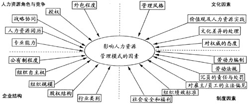 3.薪资福利 欧洲各国在薪资支付形式上各有不同。除了少数国家以外,一般以全国和行业范围的谈判为其制定工资方案的主要特征。芬兰、德国和挪威等国由于有顾问和联合决策协议制度,所以除集中谈判外,还通过局部谈判来解决工资问题。 在可变工资的实践上,与绩效相关的工资使用最为广泛,绝大部分欧洲国家已将这种形式的工资用于经理和专业技术人员,只有德国企业例外。 4.沟通授权 欧洲各国企业组织中对基层人力资源管理职能的沟通授权程度也是不尽相同。在1990年到1992年间,欧洲各国开始尝试将人力资源管理各项具体职能细化并授权基层职能部门处理。目前这种授权范围数丹麦最大,几乎涉及所有的人力资源管理职能。在法国,人力资源管理部门还具有辅导功能。在西班牙和意大利,尽管其基层人力资源主管的素质也很高,但其授权程度却相对较低(Filella和Soler,1992)。 另外,由于欧洲各国组织中从事人力资源管理的专业人士本身的知识结构及其背景等方面各异,因此各国人力资源管理模式各具特色。在意大利和荷兰,许多人力资源管理专业人士都有财会背景(Hoogendoorn et al.,1992),这使得他们在人力资源管理中更注重成本控制;而德国的大部分人力资源管理专业人士则带有法律背景,他们在人力资源管理中则比较倾向于各种各样的规章和条例。希尔特罗帕(1995)等人通过调查研究,提出了与欧洲各国彼此不同的人力资源管理模式相关的20个影响因素,其中包括企业文化、管理制度、企业结构以及人力资源角色与竞争力等方面(如图2),正是这些因素的相互作用,形成了欧洲各国种类繁多的人力资源管理模式。