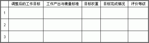 年 被考核部门: 部门负责人姓名: 直接主管: 第一部分 工作目标沟通与评价 第二部分 目标调整部分 第三部分:其它考核结果 月度考核结果 部门满意度评估结果 第四部分:综合评价 本年度部门总体绩效等级:考核者签名: 主要工作改善建议(考核者填写) |