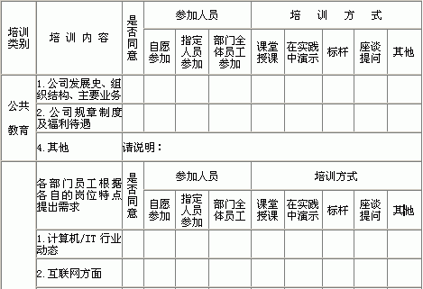 部门:_____________填表日期:_____ 年_____ 月_____日 填表说明: 1.所列内容仅供参考,在同意的项目栏打√,还可列出自己需要的内容; 2.请您根据您所在部门员工的需求填写此表 3. 如篇幅有限,必要时可另附纸说明。 谢谢您的合作 |
