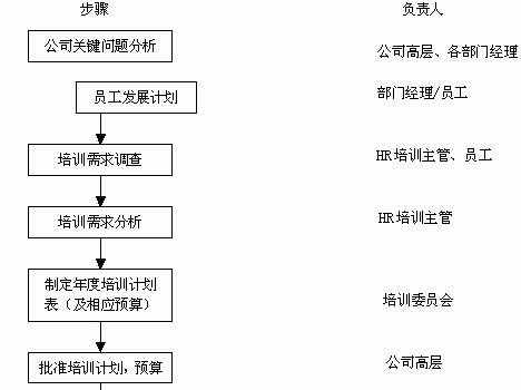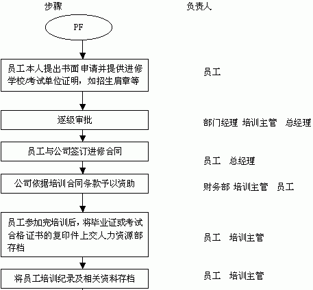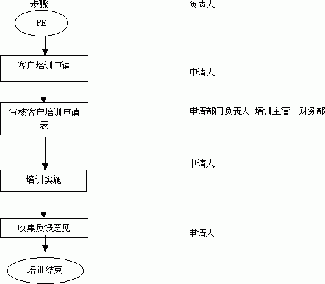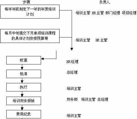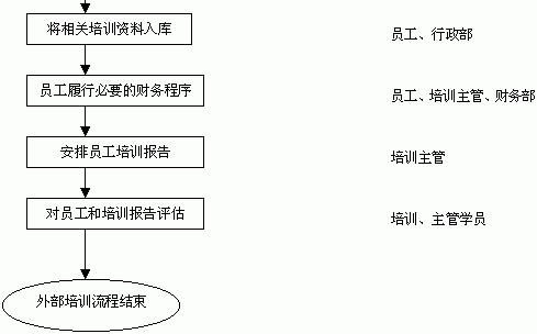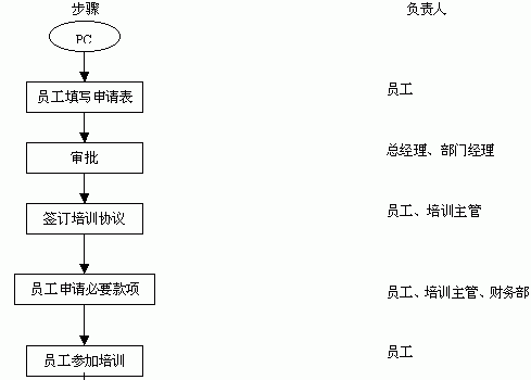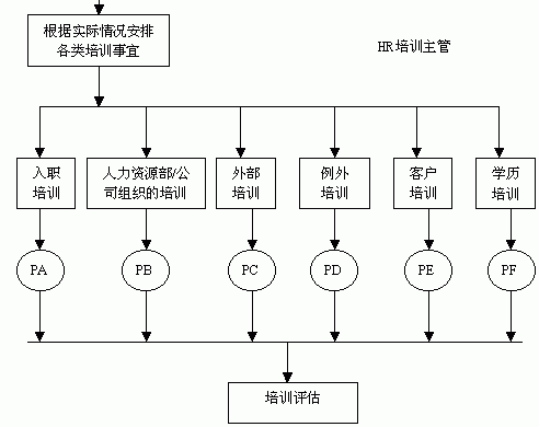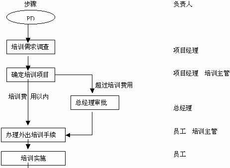 3.1.2人力资源部/公司组织的培训 3.1.2 内部培训 培训分类: 按培训内容分:技术类培训 管理类培训 按培训师分:外聘讲师培训,内部讲师培训 在下面情况下,人力资源部/公司组织培训: 国际计算机领域取得某项重大的突破性的进展,公司认为有必要让全体员工了解、掌握并适应; 根据公司发展要求,认为有必要针对某项专业技术或专业知识进行培训,而这种培训有助于提高全员的业务素质和技术水平; 公司在进行某个项目的开发和研究时,为使参与该项目开发和研究的人员对该项目有一个透彻的了解和认识,掌握相关的技术和知识,或因知识和技术的局限,出现一时难以解决的问题; 公司接到某项业务,在业务的执行过程中,遇到某个难以克服的障碍; 部分员工对某一专业技术或知识产生困惑,并希望通过培训加以解决; 公司委派进行外出培训的员工在接受培训后,将培训的内容对有关员工进行传递培训; 工作进行调整的员工需要加强对新任工作的了解,认识和掌握相关的技术和知识; 公司在管理,市场等方面,需要提高工作效率,引进最新管理或市场理念,组织相关人员参加培训; 公司需要通过相关国内,国际认证,举行的培训。 ②当出现需要对员工进行内部培训时,可以在各部门的定期技术交流会上进行,也可由公司组织内部培训班,聘请专家讲授。 ③各种内部培训,需由有关当事人向人力资源部提出申请,经技术总监研究,认为确有必要,方能组织进行,由人力资源部组织安排时间、地点。 ④每个员工都有担任培训教师的义务,不得找借口推脱。 ⑤各部门经理将本部门主动提供的培训提前一周上报人力资源部。 培训步骤(外聘培训): 3.1.3外部培训 ①在下面情况下,公司对有关人员进行外出培训: 公司接获国内或国际有关部门组织的计算机最新技术和发展动态的培训通知,而公司认为有必要派员参加; 国际计算机行业取得某项重大的突破性的进展,这种突破对公司的发展将产生重大影响,而公司又不能通过常规渠道对该项突破有所了解和掌握,必须派员到国内外有关研究机构深造培训才能获取; 公司遇到某项重大问题,在短时期内和本地区难以找到解决的办法时,必须派员到国内外有关研究机构进行深造培训; 员工在其岗位上需要进行相应的知识培训,以提高工作效率,保证顺利开展工作,必须派员到国内外相关培训机构学习才能适应需求。 ②各种外出培训,需由有关当事人提出申请,由公司领导进行研究后确定,并提交书面报告,报请总经理审批,人力资源部备案。 ③ 加外出培训的人员选择: 本着“公开、公平、公正”的原则,所有员工均可提出申请,说明自己的理由及优势,参与竞争; 由公司领导根据员工的知识水平、业务水平、工作能力及对新知识的接受能力等多项因素进行综合评定,选择最适当人选,进行指派。 ④凡公司出资外出培训的员工,回公司后须就所培训内容根据需求对公司其他相关员工进行内部培训,并对讲员予以评定(参看有相关内部讲师评定手则)。拒绝培训报告者除不得报销相关费用以外,将处以200元/次的罚款,并取消其一年内的外出培训资格。 注:公司外出培训申请表,参看附录7;员工外出培训协议书,参看附录8;内部评分表评分标准,参看附录9;内部培训评估表,参看附录10。 培训步骤: 3.1.4例外培训 例外培训包括公司项目实施中,项目组需要的培训,技术交流,产品介绍等。可以由公司提出需求,也可以在其他公司发出邀请函后酌情参与。 1)培训 对于例外培训中的培训,指在项目实施过程中,项目组人员需要某些方面的知识补充,提出培训需求,派人员参加外出培训。 项目经理有权决定项目费用在2000元以内(包括食宿)的项目相关外出培训,但必须与人力资源部协调,方可生效。超过2000元的培训,需报总经理审批,方可执行。 安排培训,必须在培训日期一个星期以前通知人力资源部。确定培训后,参与培训人员必须到人力资源部办理外出培训相关手续。 培训期间,公司员工应遵守有关制度,服从管理人员指挥,认真完成每次培训任务。 参加培训员工应及时签到,培训完后,应积极配合做好意见反馈统计;年终,对于积极参加培训,工作出色的员工,报人力资源部,作为受聘、转正、晋升、加薪、年终考核和职称评定的依据。 培训步骤: 2)技术交流 申请部门应提前一周认真、详细填写申请计划,并提交人力资源部存档。 技术交流期间,要遵守培训纪律,按时签到。 技术交流步骤: 3)产品介绍会等 产品介绍会议等相关邀请函,统一交人力资源部存档。 参与人员由技术支持部提名,再报总经理审批。审批后,人员名单报人力资源部存档。 3.1.5客户培训 1)申请部门应提前一周向人力资源部提出申请,并认真、详细填写用户培训申请计划; 2)人力资源部安排客户培训计划; 3)组织客户培训活动; 4)申请部门应负责客户的联络及协调工作; 5)培训完毕,收集客户培训反馈意见; 注:客户培训申请表,参看附录11; 培训步骤: