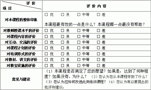 1培训流程 在培训流程中,涉及到各步所需的用表,统一参看附录中查找。培训纪录,参看附录1; 公司技术培训需求调查表,参看附录2;公司管理培训需求调查表,参看附录3;公司培训签到表,参看附录4;公司培训现场记录表,参看附录5;公司学员评价表,参看附录6。 2 培训政策 1、公司员工培训制度的建立,是为了保证公司的工作得以顺利进行,以达到培养和造就一流的管理人才、一流的技术人才、一流的市场人才,从而创办一流企业的目的。 2、培训的目的是为了提高员工业务水平、文化素质及综合竞争能力,改善员工的知识结构,统一员工的思想和认识。技术类培训使员工通过培训了解最新的计算机技术发展和动态,跟踪国际最新技术,把握计算机产业的发展方向,增强开发研究和创新的能力,确保公司在未来的发展中立于不败之地。管理类培训使员工通过培训提高相关的管理技能,以此提高公司总体的工作效率,确保公司的稳定发展。 3、员工培训分为非学历培训和学历培训。非学历培训根据不同的内容分为岗前培训、在岗技能培训和管理培训;学历培训则根据不同的性质和形式分为学位教育和非学位培训。 4、员工既有接受培训的权利,也有培训他人的义务。对公司组织的一切培训活动,所有员工均应积极参加并提出合理化建议,各部门也应积极配合并协助落实。 5、员工的培训情况将存入个人技术档案,作为其受聘、转正、晋升、加薪、年终考核及职称评定的重要依据。 3培训形式 3.1非学历培训 公司的非学历培训,根据不同的培训对象及培训内容分为入职培训、人力资源部/公司组织的培训、部门培训、进修/专业考试、协会活动、外部培训。 3.1.1入职培训 培训对象:公司新进员工 培训内容: 1)公司基本情况介绍; 2)公司技术体系介绍 3)公司各项规章制度的贯彻; 4)上岗基本工作技能培训; 5)公司项目介绍; 6)主要基础技术培训; 7)公司的企业文化、企业宗旨、企业精神的宣传和岗位工作职责和考核标准的明确。 培训目的: 1)通过礼仪规范的教育,使员工了解公司的各项规章制度,认同组织文化和企业目标,为树立公司良好的企业形象而共同努力; 2)通过公司企业文化的培训,增强员工的“主人翁精神”和“主动参与意识”,确立其责任感和使命感,以培养其忠诚、敬业和献身精神,而且为构筑公司成功的、独特的企业文化而共同进取; 3)通过市场意识和知识产权的培训,培养员工的市场观念、自我保护观念、保密观念, 以提高员工的综合竞争能力; 4)通过对新员工进入各部门前的基本工作技能培训,使他们的综合素质得到提高,以便于更好的调整心态,积极的投入工作; 5)通过对公司项目的介绍,以及基本技术的培训,使他们在最短的时间内熟悉和适应岗位工作,尽快在各自岗位上发挥作用。 培训课程: i.公司介绍 ii.各部门介绍 iii.公司技术体系介绍 iv.公司产品介绍 v.公司规章制度 vi.文档规范、软件工程 vii.基本工作技能培训 viii.岗前技术培训 注:其中i-v由人力资源部负责培训,vi-viii由员工所在部门负责培训。