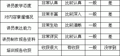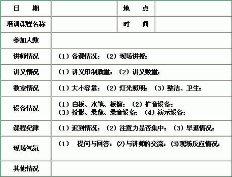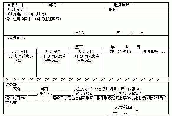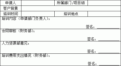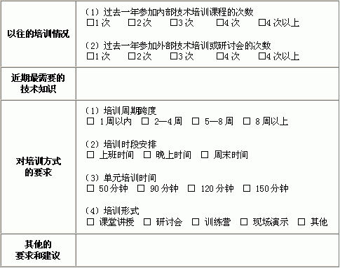 3.2学历培训 学历培训的目的是为了加强员工的队伍建设,提高员工的技术水平和技术竞争能力,激励员工奋发向上、积极进取,使公司在进入二十一世纪时,有一支高智商、高学历、高水平、高素质的员工队伍,从而树立公司优秀的企业形象。 培训对象: 在软件开发部、技术支持部从事专业技术工作的技术人员中未获得本科学历的员工需在5年内通过成教或自考的方式取得相关专业本科学位; 具有本科学历的下列员工可申请攻读计算机或管理专业硕士研究生课程; 1.部门管理人员; 2.已在公司工作两年以上、公司及部门的业务骨干; 3.公司及部门认为资质好、潜力大、有培养前途的员工。 培训方式: 1)在职攻读硕士研究生学位课程,取得研究生全部课程结业证书; 2)在职攻读硕士研究生学历课程,结合公司的研究项目完成学位论文,并以在职人员身份申请答辩,取得硕士学位; 3)通过研究生入学考试,在职攻读硕士研究生学位课程,结合公司的研究项目完成学位论文,并以在职人员身份申请答辩,取得硕士学位和硕士学历。 注:员工培训合同,参看附录12。 培训步骤: 4培训费用审批程序 人力资源部/公司组织的培训 5 附录 附录1 培 训 纪 律 1.不得迟到,早退; 2.不得以任何私人理由在培训期间私自离开培训场所; 3.不得在培训期间抽烟,进食及睡觉; 4.不得在培训期间私自交头接耳; 5.要求认真做好培训笔记,积极配合讲师讲课; 6.要求学员将手机等通讯工具一律调成振动,不得在培训场所接听电话。 人力资源部 附录2 公司技术培训需求调查表 姓名 职务