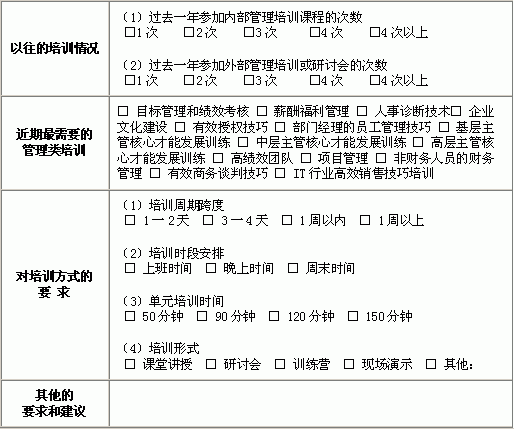 附录3 公司管理培训需求调查表 姓名 职务 附录4 公司培训签到表 培训内容: 培训讲师: 培训公司: 培训时间: