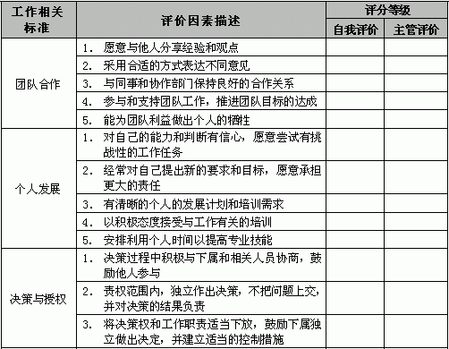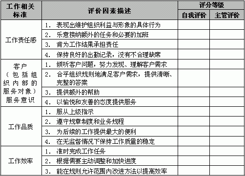 被评价者个人资料: 姓名:性别:年龄:部门: 评估日期:任职时间:职位: 评价标准和操作说明:请在适当的栏内填写等级对应的字母。 A.(10分) 出色,绩效特别优秀,并始终超越本职位常规标准要求 B. (8分) 优良,工作绩效经常超出本职位常规标准要求 C. (6分) 可接受,工作绩效经常维持或偶尔超出本职位常规标准要求 D. (4分) 需改进,工作绩效基本维持或偶尔未达到本职位常规标准要求 E. (2分) 不良,工作绩效显著低于常规本职位正常工作标准的要求N. 此项目不适用于此人 主要工作改善建议(个人填写) 工作期望(主管填写) 上级主管审核意见 签名: |