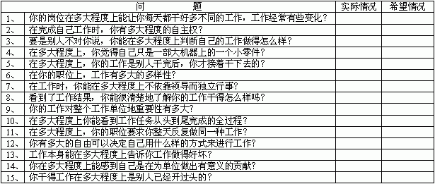 下面这些问题与你目前所从事的工作的特点有关,请就每一道题目根据你的实际情况进行选择。对每一道题目都请你做出两次评定,第一次是针对你目前工作的实际情况进行选择,第二次是按照你所希望的情况进行选择。 针对每一个问题,都按照以下5个等级进行评定: 5——很大程度或具备很多这种特性。 4——较大程度或具备较多这种特性。 3——中等水平。 2——较小程度或具备较少这种特性。 1——很小程度或具备很少这种特性。 ![]() |