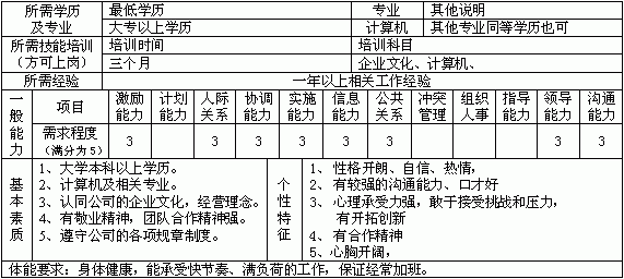 资料编号:003 二、工作内容 1、工作概要 负责客户中心IBM产品的销售 2、职务说明(逐项说明工作任务、职责、权限、时间消耗) 三、工作关系: 四、任职资格: 五、工作场所: 六、考核标准: 1、工作绩效: 2、工作态度: 3、工作能力: 4、专业知识: 5、责任感 6、企业文化 7、发展潜力 8、协调合作 9、品德言行 10、成本意识从以上十个方面来考核 七、备注: 直接上级: 该职务执行人: 年 月 日 |