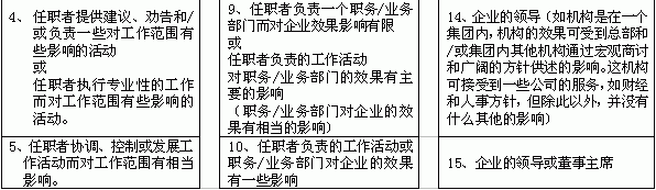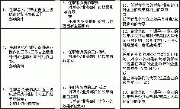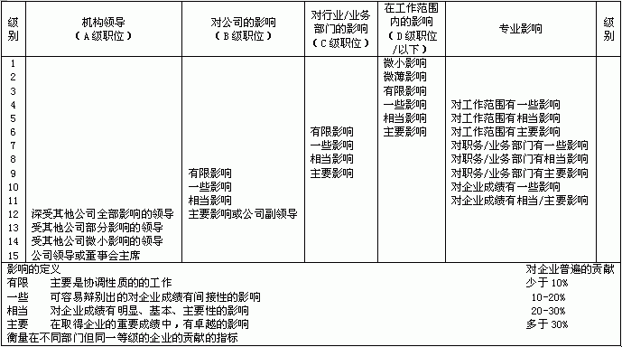介 在过去几年里,职位评估得到了越来越广泛的运用。其原因在于:应用系统性的职位评估方法,可消除职位名称的歪曲,并可在不同部门或企业当中真实和一致地比较所有职位的判别。使用职位评估系统具有方便招聘工作,有利于职位发展规划、绩效评估、人员升降、工作调整、公司发展等优点,当然也为建立合理的工资水平提供了方便。 本系统是一个职位评估的新方法,被诸多跨国企业和国内知名企业所彩。它结合了许多长期从事职位评估工作专家的经验基础,含有可以对各行业所有职位进行比较的必要因素。整个评价体系由三大方面七大要素组成。 人力资源部在总结了去年《某职位制度》推行过程中的经验和教训,结合某的战略发展要求和行业竞争环境,决定在全集团推广此系统。 评估系统 职责规模 1、对企业的影响 2、监督管理 职责范围 3、责任范围 4、沟通技巧 工作复杂程度 5、任职资格 6、解决总是难度 7、环境条件 评估系统 职责规模 职责范围 工作复杂程度 因素1 对企业的影响(1) 因素1 对企业的影响(2) 因素1 对企业的影响(3) 因素2