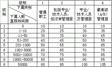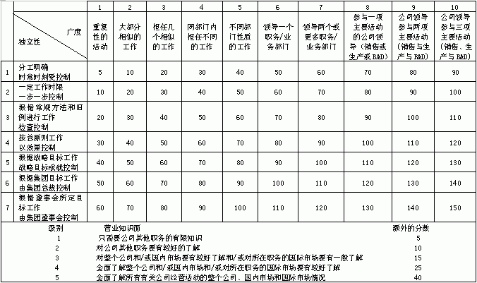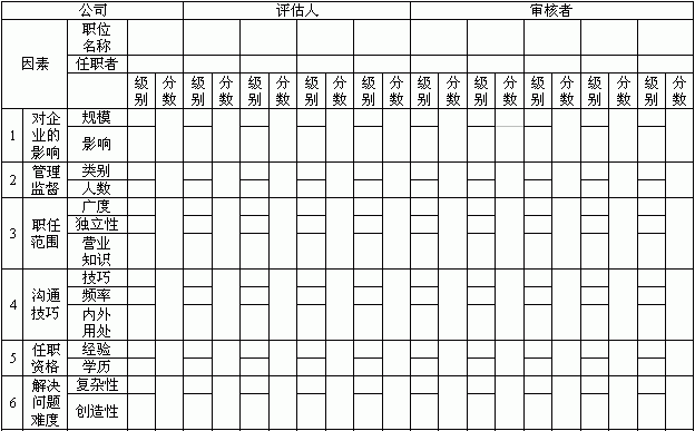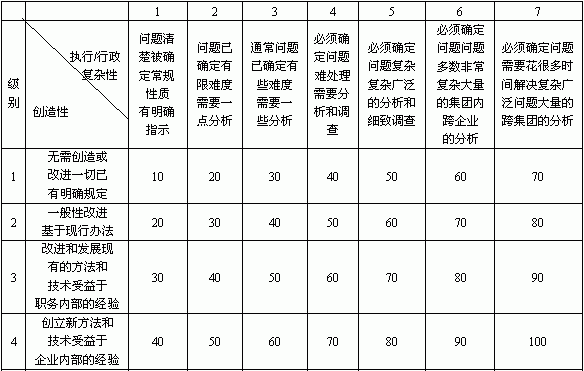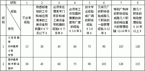 因素3 责任范围 因素4 沟通技巧 因素5 任职资格 因素6 因素7 环境条件 环境 活动有身体、精神和技术方面的压逼 风险 政治上或工业上的伤害 职位评估总结 分数转换表 ![]() |