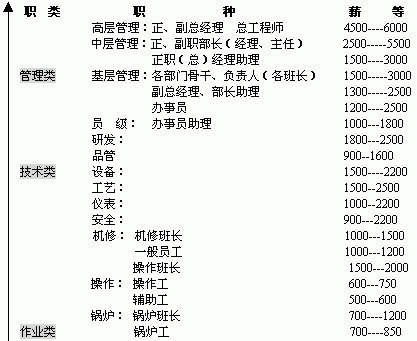 一、工种统计: 总经理级:由董事会会议决定。 副总经理级:由总经理提交董事会决定 部门经理级(正、副部长): 科员:(部长及正、副总经理助理) 办事员:(工段班长、机修班长、中控班长、操作班长、生产班长、各部门骨干) 办事员助理级:(工段助理) 普工: 二、基本薪酬确定: 1、中层管理人员: (正 职): (副 职): (助理级): 2、基层管理人员 : (正 职): (副 职): 3、管理部门骨干 (负责人): 4、产品制造部门各主管: 5、专业技术人员: (1)、 工艺员: (2)、 设备员:(维修员) (3)、 安全员: (4)、 采购员: (5)、 仪表工: (6)、 机修工: (7)、 电 工: (8)、中控员: (9)、叉车员: (10)、化验员: (11)、锅炉工: 11、仓储人员: 12、财务人员 12、普通工人: 普通操作人员、辅助工 13、后勤人员: 14、医务人员: (等级按人力资源薪酬设计标准) 工资等级图表 ![]() |