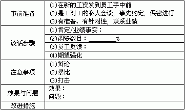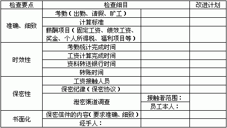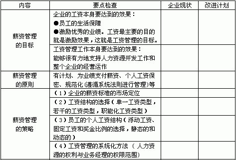 使用说明 本表用于检查企业的工资发放管理。填写表格,检查并改进你企业的工资发放。 年度工资调整以外的其他工资调整类型检查表 使用说明 对照上表几种年度工资调整外其他的工资调整类型应该注意的事项,检查一下你公司的此类工资调整是否合理,并加以改进。 薪资管理问题与困境解决表 使用说明 如果你的企业存在薪资管理上的问题,选择存在何种问题和困境,根据表格中提供的原因思路分析其原因,根据对策设计思路设计一个解决对策,并在实践中加以检验和改进。 企业经营效益与员工工资水平矛盾解决方案设计表 使用说明 你的企业存在经营效益与员工工资水平之间的矛盾吗?如果存在,完成上表。 福利工作策略标准检查表 使用说明 对照表中的福利工作策略标准,检查一下你企业的福利工作现状,并制定改进计划。 企业自主福利项目开发方案设计表