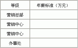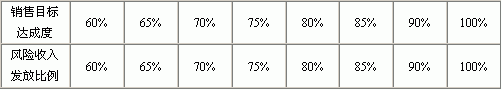 第一章 一般规定 第一条 公司销售人员,包括营销总部、营销中心.销售中心、办事处所有员工的工资待遇,除有特殊规定外,均应依照本办法办理。 第二条 本办法由人力资源部制订,并呈报总经理核准实施,如有未尽事宜,由主管销售的副总及各销售部门经理提出,与人力资源部共同协商后修正再公布实施。 第三条 本办法于每年年底根据公司的经营情况重新修订一次。 第二章 工资制度 第四条 营销总部、营销中心、销售中心、办事处负责人的工资收入实行年薪制。 (见第三章 年薪制) 第五条 一般销售人员的工资收入实行月薪(基础工资)加绩效奖金制。 (见第四章基础工资和第五章绩效奖金) 第三章 年薪制 第六条 营销总部、营销中心、销售中心、办事处负责人的年薪标准由公司经理会确定。共分为四个等级标准,如下表: 第七条 年薪由基薪和风险收入两个部分构成,其中:基薪占年薪的60%,按月度发放;风险收入占年薪的40%,按年度发放。 第八条 基薪月度发放标准按下列公式计算:基本月薪=(年薪×60%)÷12;基本月薪一经确定,年度内不再变动。 第九条 风险收入按年度公司销售指标完成情况和个人负责区域销售指标完成情况考核浮动发放。如下表: 销售目标达成度与风险收入发放比例 第十条 风险收入年度发放标准按下列公式计算:风险收入=年薪×40%×风险收入发放比例。 第十一条 各销售部门负责人按规定领取应得年薪外,不再另外享受一般销售人员的基础工资和绩效奖金。 第四章 基础工资 第十二条 一般销售人员的月工资为基础工资,基础工资分为四个等级标准, 如下表: 各等级内级差相同。 第十三条 公司根据各销售员的营业能力、工作实绩、劳动态度等要素,确定不同的基础工资标准。 第十四条 新进销售人员根据本人的技能、销售经历、销售年限确定基础工资标准。试用期两个月,试用期工资按基础工资的70%发放。 第五章 绩效奖金 第十五条 绩效奖金根据各销售员的综合业绩,每季度发放一次。考核等级与奖金标准如下表: ![]() |