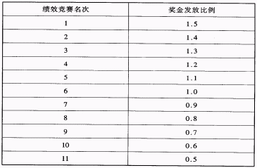 (一)本公司为激励同仁提高工作士气,发挥团队精神并藉以改善同仁待遇,特设置经营绩效奖金并订定‘经营绩效奖金发放办法’。 (二)奖金的来源系依各直线单位每月所填制的‘直线单位经营绩效评核表’中的‘本期损益’总合计金额的25%提供发放。 (三)奖金的发放对象,为迄计算奖金的当月底止本公司已升任正式的全体同仁,试用中的同仁不予列为发放对象。 (四)奖金的发放计算一律依当月份的‘基点奖金额’计算,其计算方式如下: 1.当月份提供发放的奖金总额除迄当月底止已升任正式的全体同仁的基点总数等于每基点奖金额。 2.基点的换算如表6.5.12: 3.营业主任的职等比照服务主任的平均职等六等,营业人员的职等比照服务人员的平均职等四等换算。 (五)幕僚单位人员,其奖金的计算,一律依当月份的基点奖金额与个人的基点成绩计算。 (六)营业单位与分公司人员,其奖金的计算一律依当月份的经营绩效竞赛名次为发放的计算标准,其最高与最底的发放比例原则上为3:1,唯得视经营的实际情形随时增减其差距;换算的比例如附表。 (七)服务中心的奖金发放标准比照幕僚单位计算。 (八)发放的奖金金额的计算,一律以‘元’为单位,元以下四舍五入。 (九)奖金的发放日期为每月25日。 (十)本办法经呈总经理核准后公布实施修订时同。 备注:本表比例得视经营实际情形随时增减其差距。 |