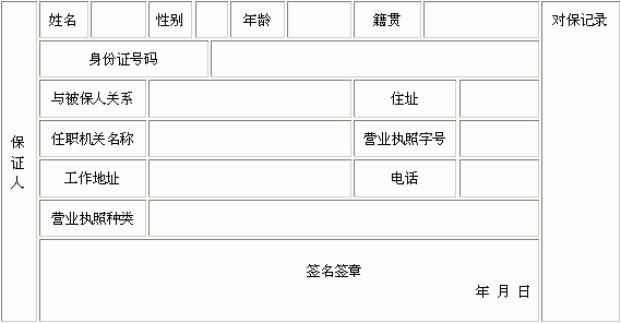 兹保证 先生,品行端正,于担任 贵公司 职务期间,决无营私舞弊挪用亏欠款项行为,如有违犯,本人愿负一切法律连带赔偿责任,并放弃上诉抗辩权,特此立书保证。 此 致 股份有限公司 ![]() |